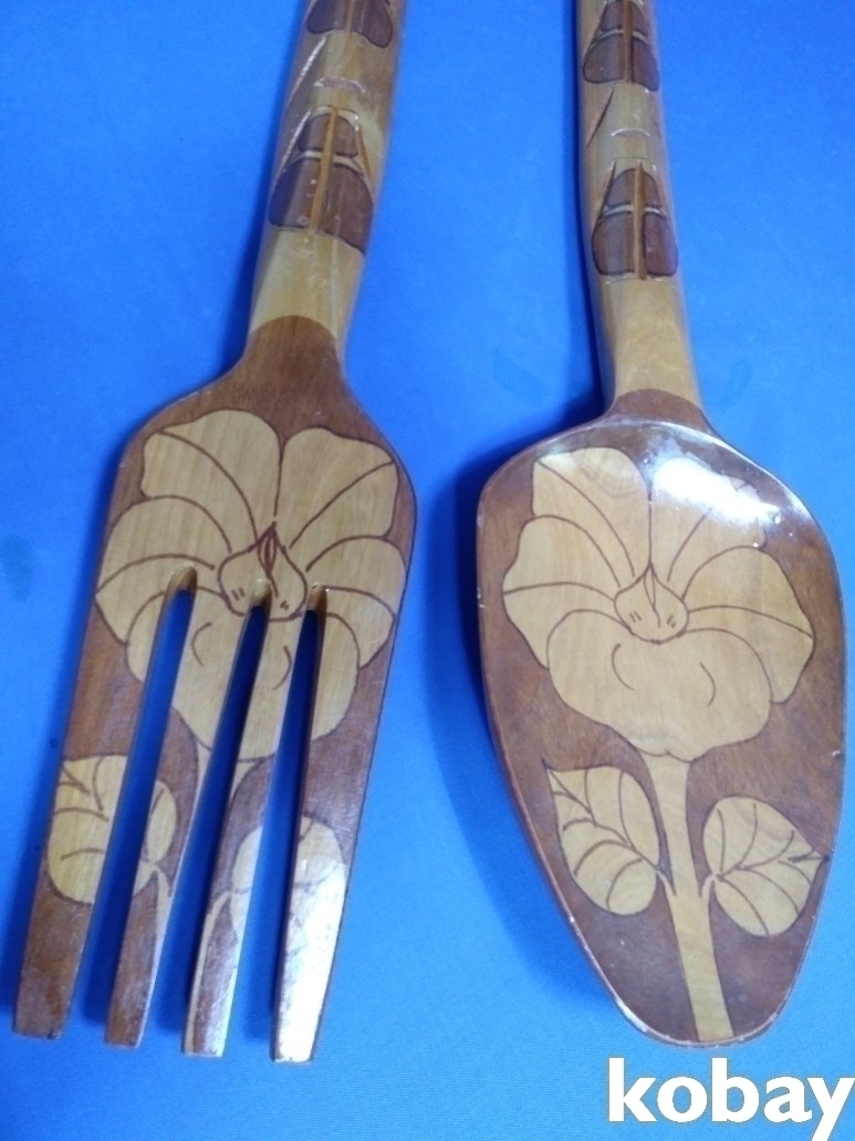 꽃 문양이 있는 나무로 만든 수저와 포크 입니다.