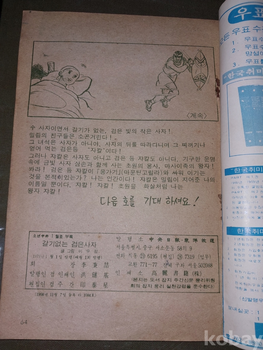 (만화) 갈기 없는 검은 사자 - 소년중앙 1979년 1월호 부록/ 세월의 흔적이 있으나 낙장 낙서는 없는 완전본임