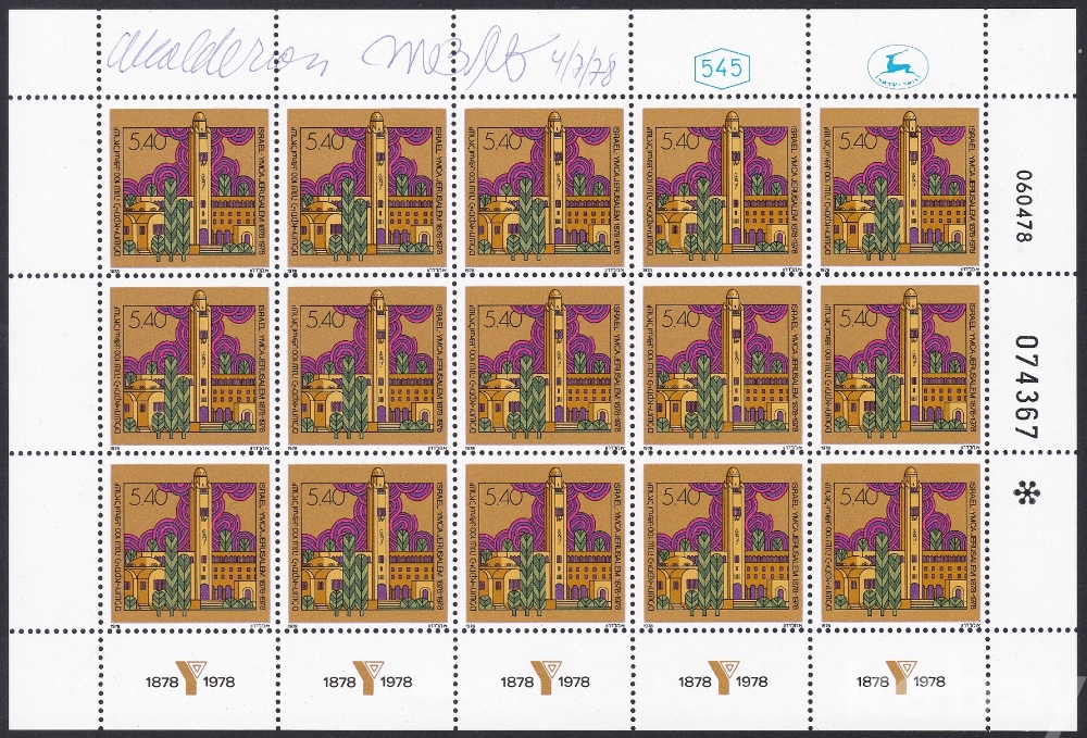 (하늘천) 이스라엘 Sc698 예루살렘의 YMCA 100주년, 디자이너 사인 시트