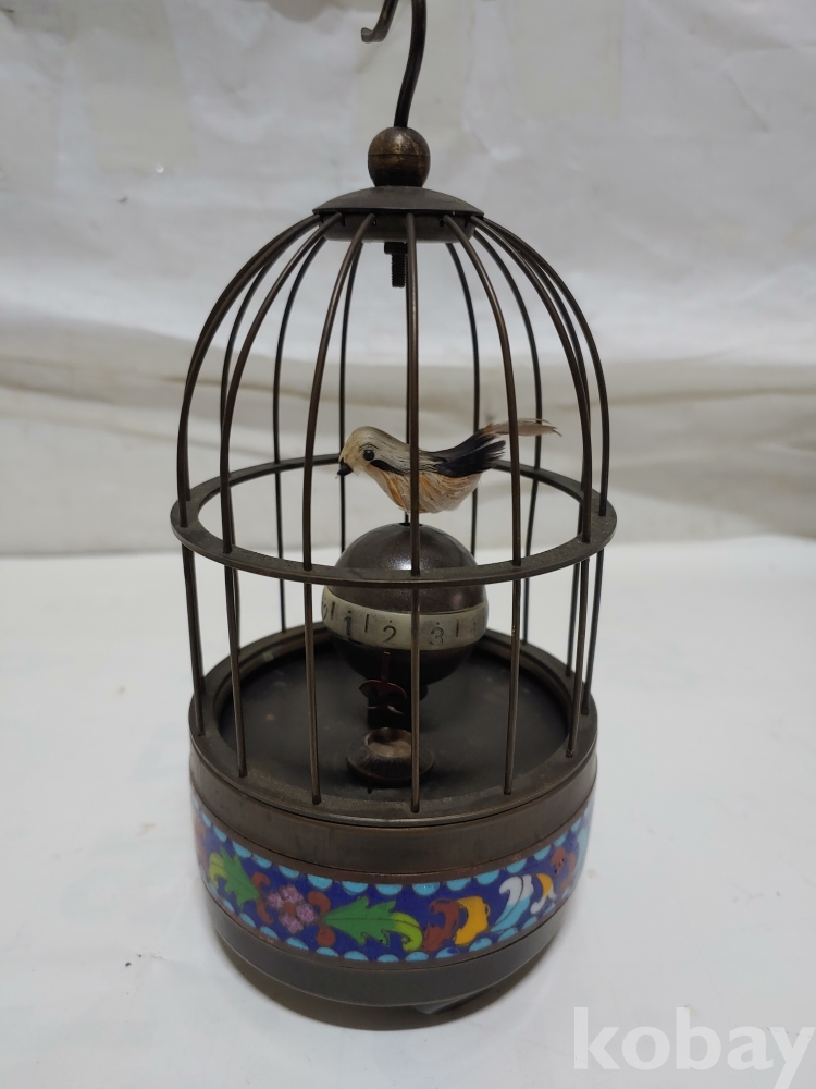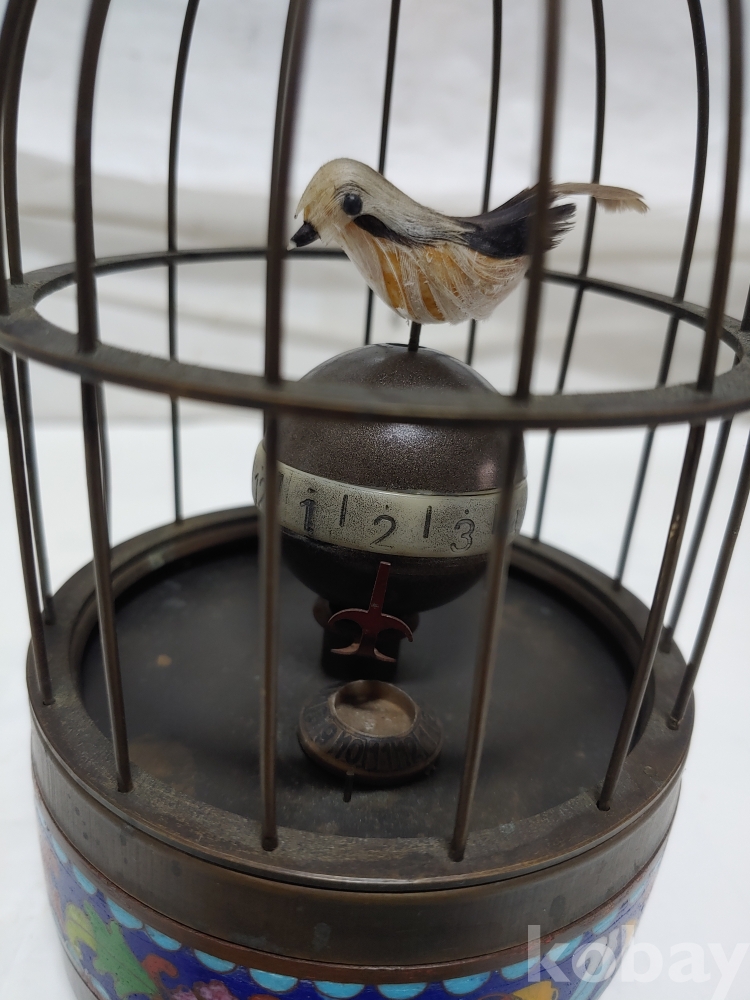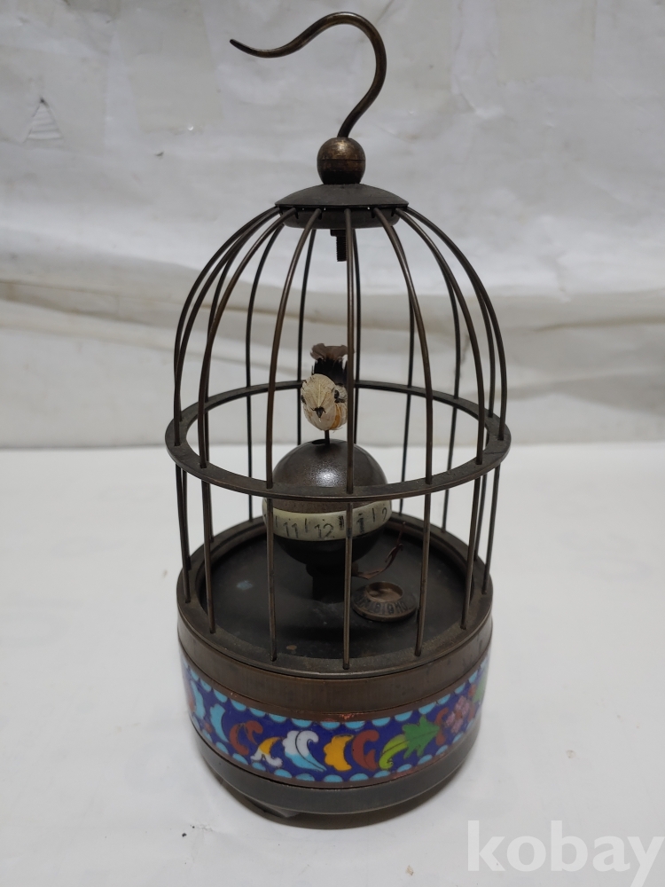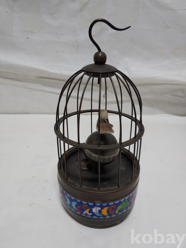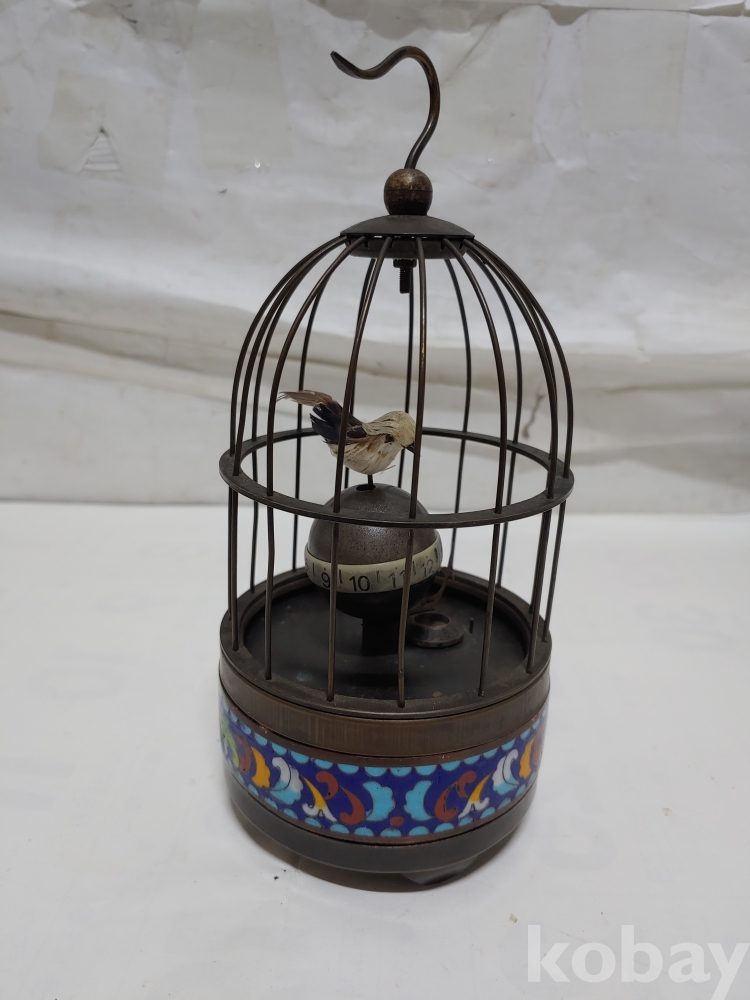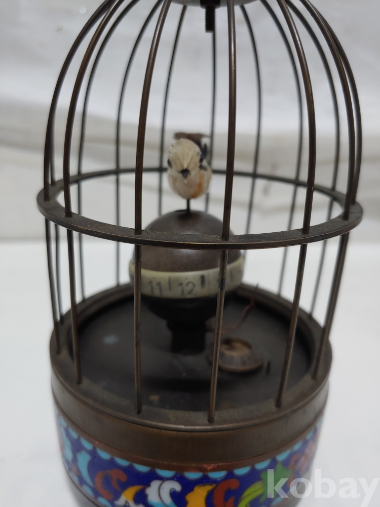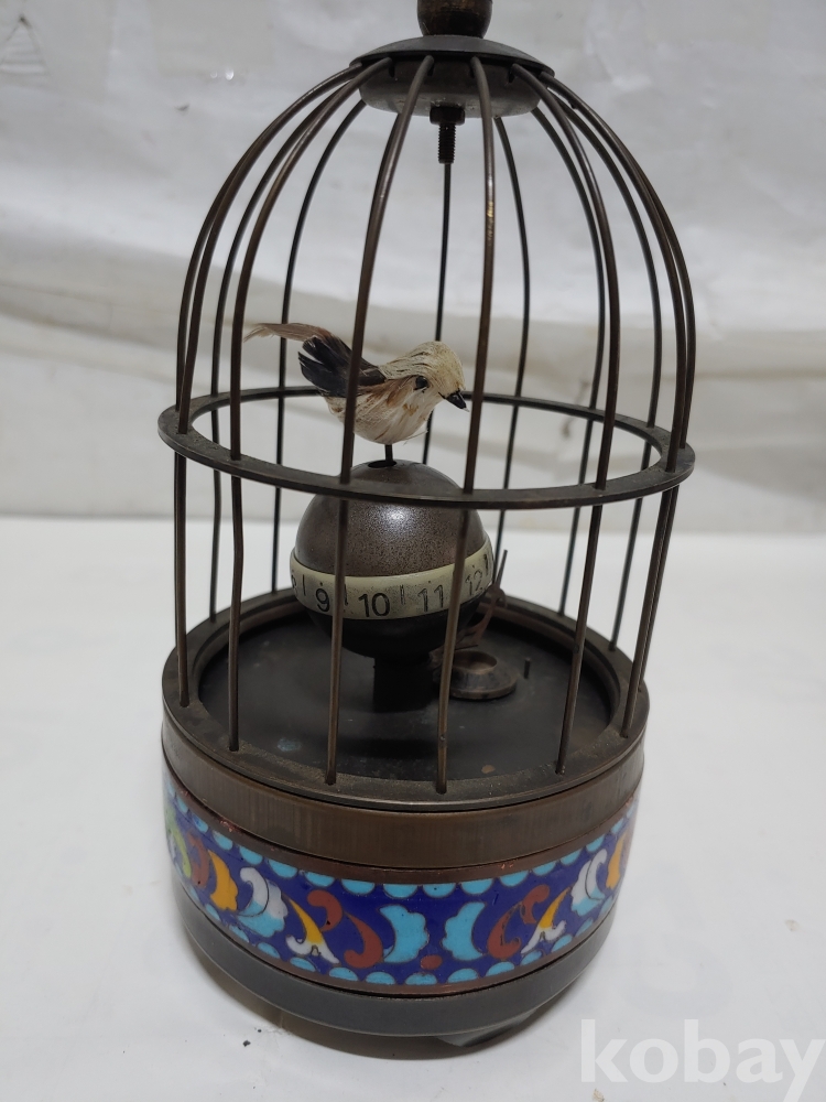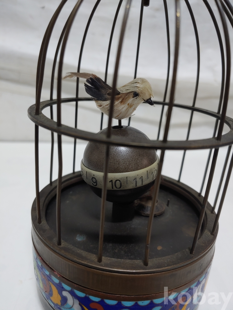 ""새장에 예쁜 새가 있는 조그마한 크기에 동 테엽 시계""
