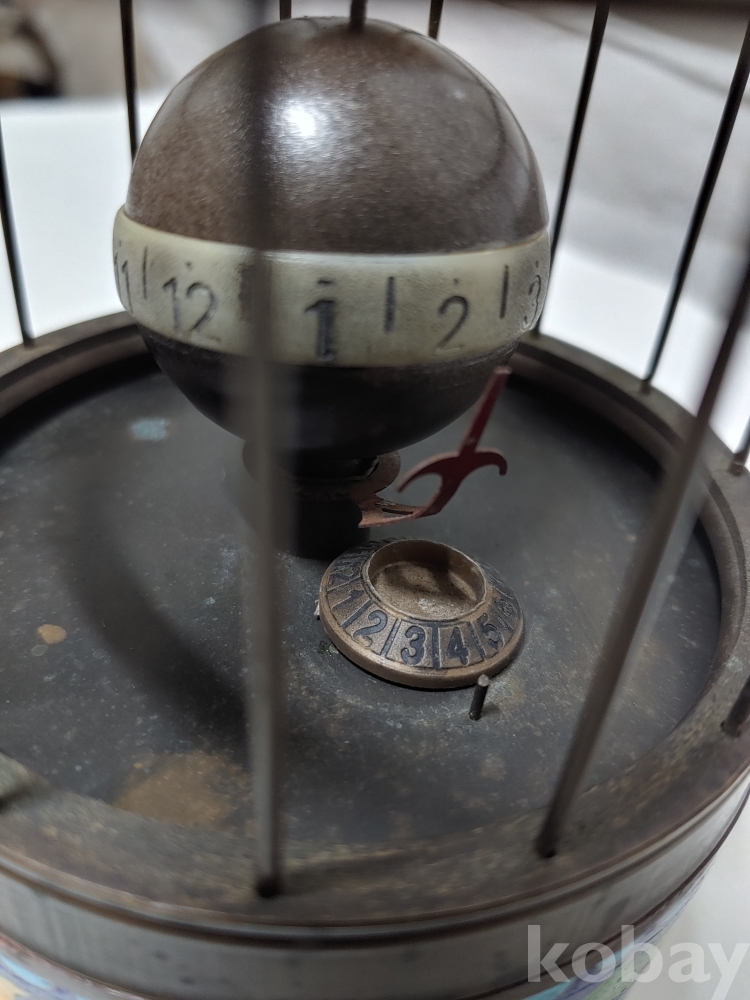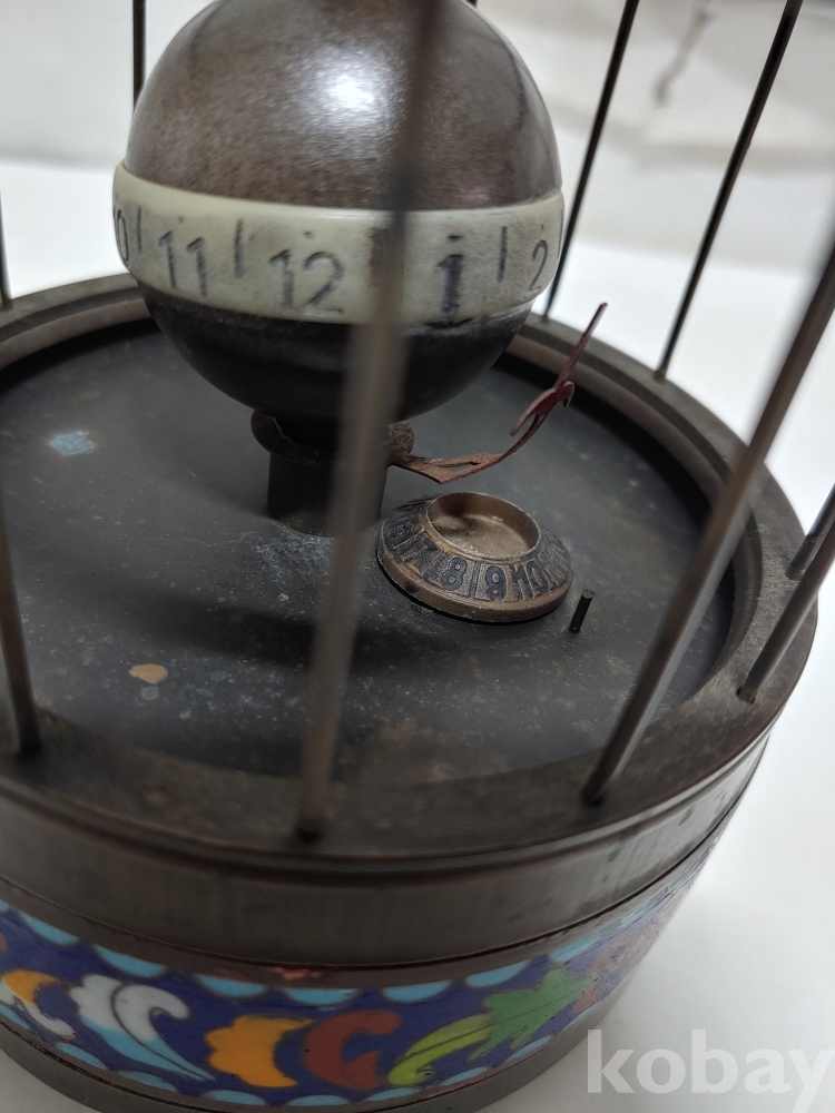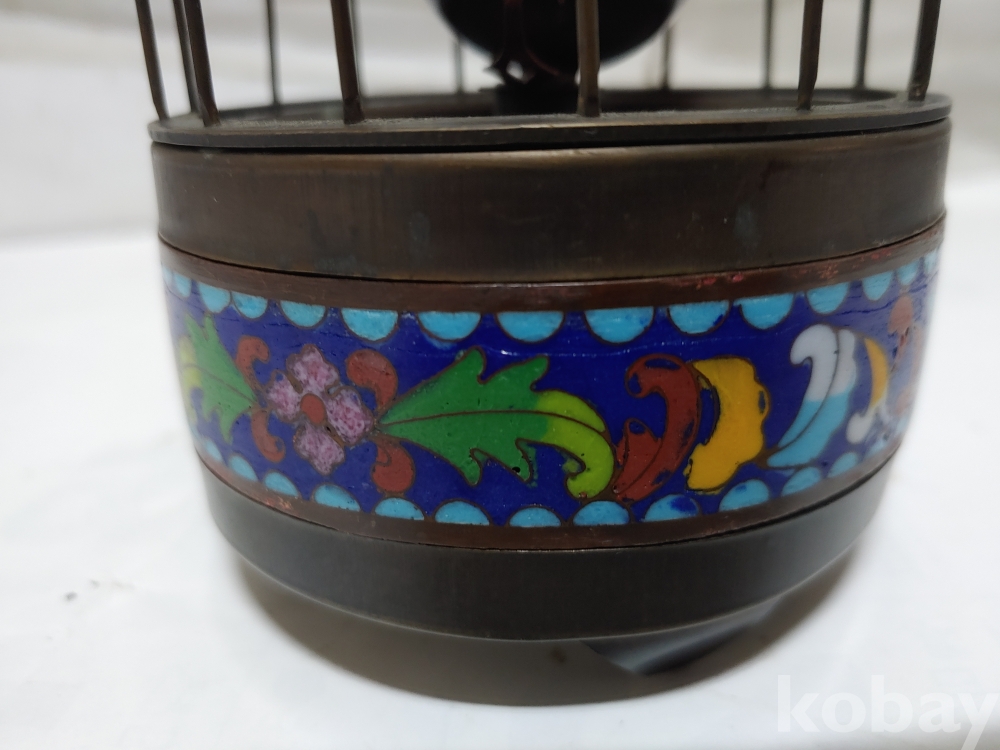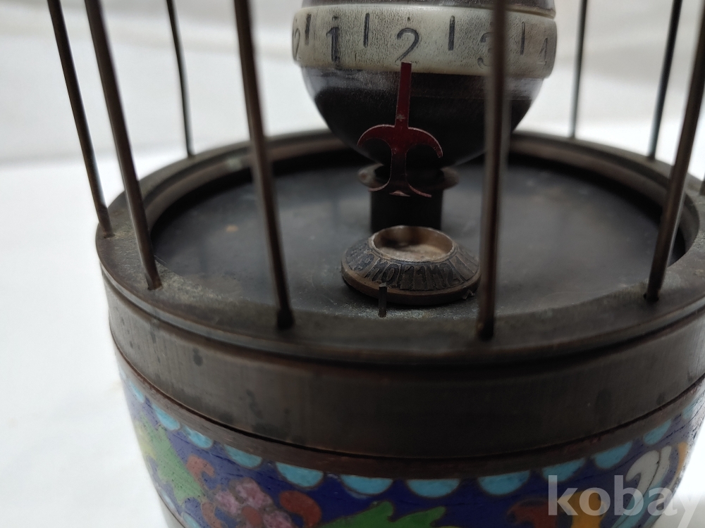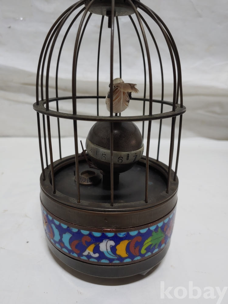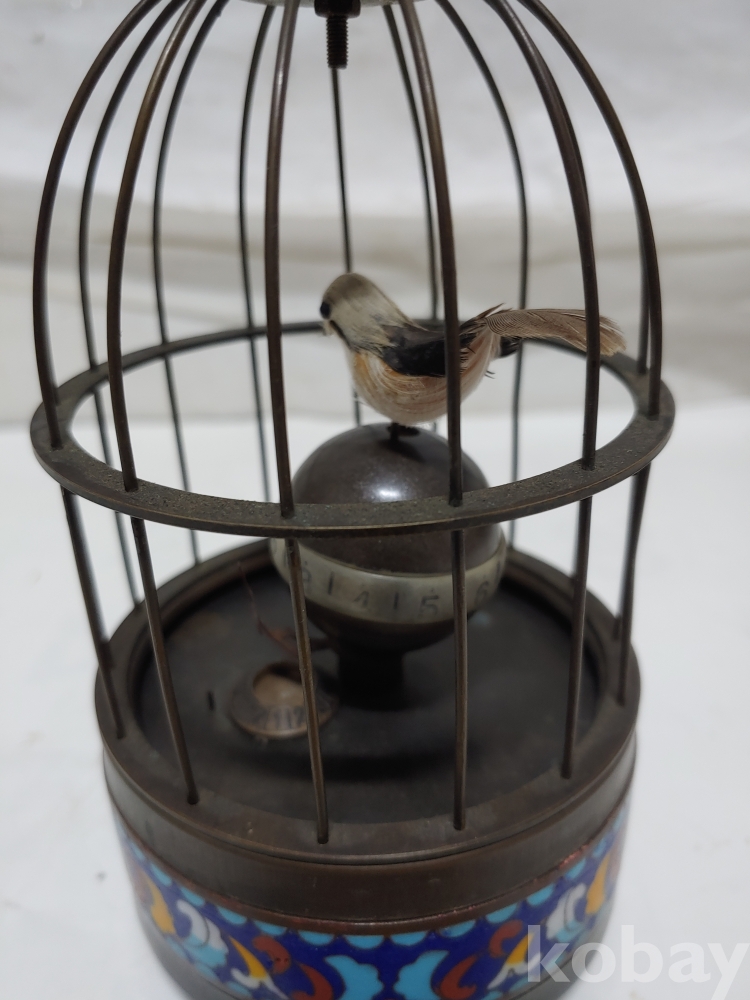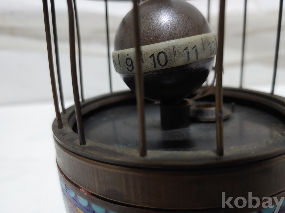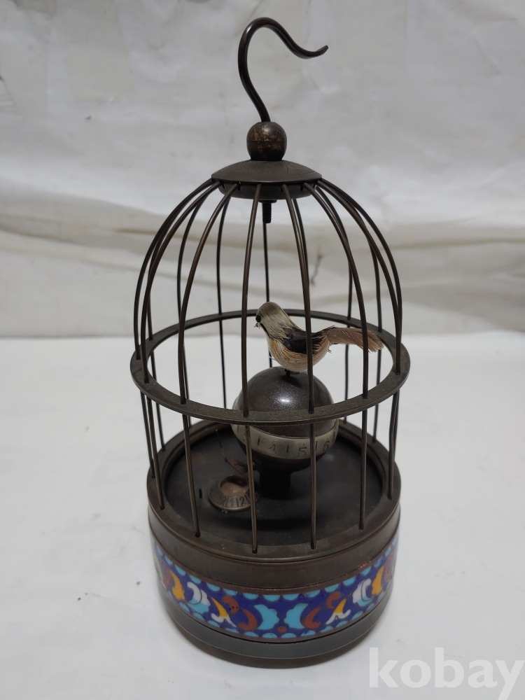 ""새장에 예쁜 새가 있는 조그마한 크기에 동 테엽 시계""
