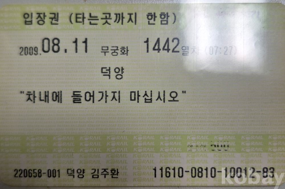 2009년 11월 30일 이전에 발행된 철도 MS(마그네틱) 단말기 덕양역 입장권입니다.