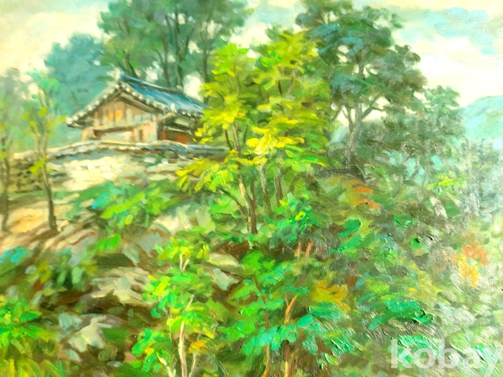 작품 설명: 전경에는 길과 수목이 배치돼 있으며, 중경에는 돌담과 한옥이 자리 잡아 화면의 중심을 형성하고 있다. 주변에는 수목이 밀도 있게 배치되며 자연과 건축이 어우러진 구성을 보이고 있다. 녹색과 갈색 계열이 중심을 이루며 마을 풍경의 안정적인 공간 구성이 표현돼 있다.