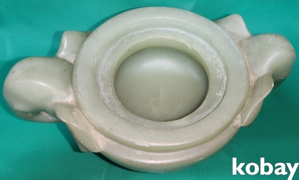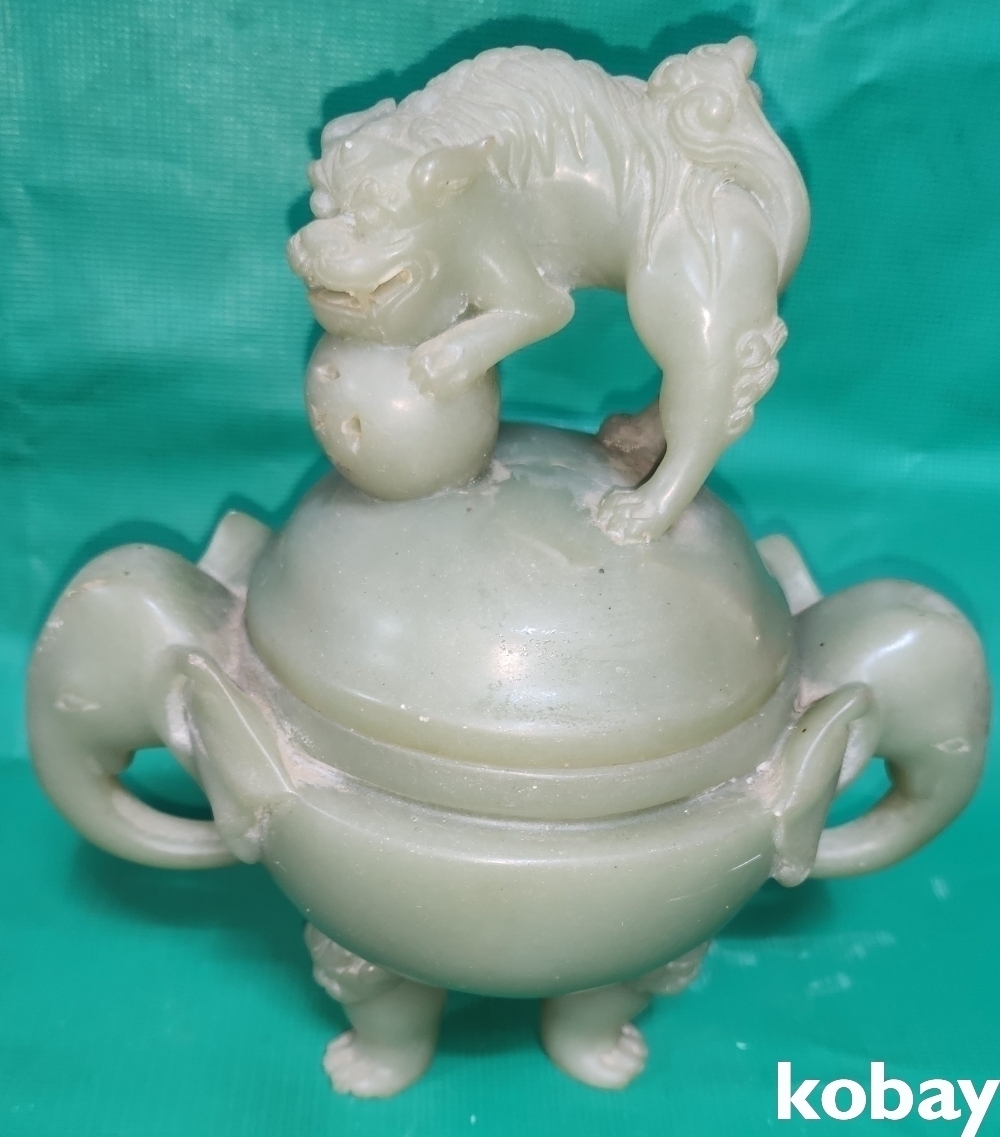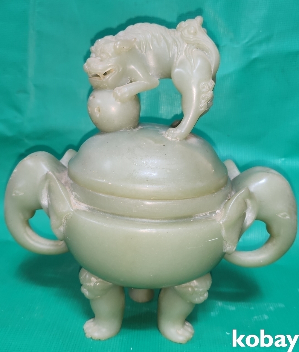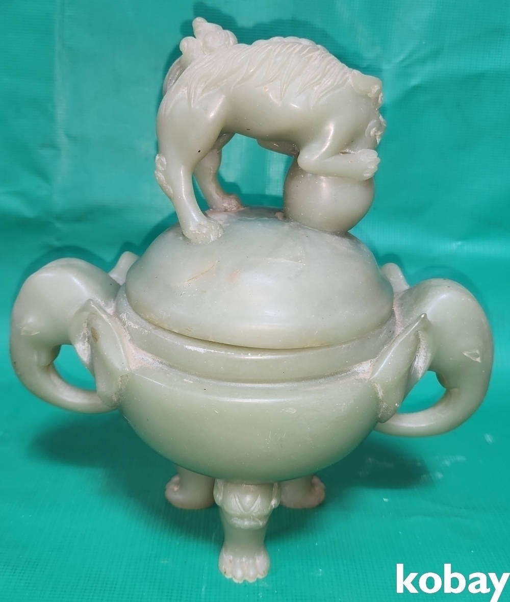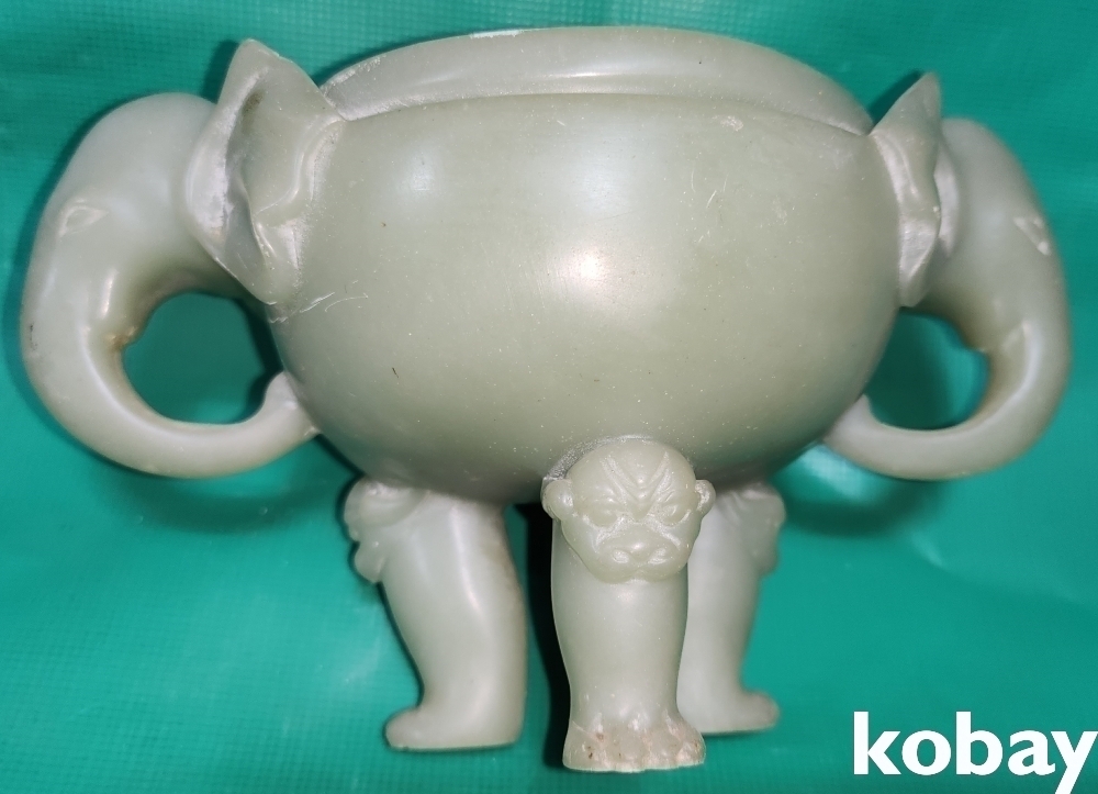 청옥으로 만들어진 코끼리와 사자 문양 삼족 향완(香椀)입니다,