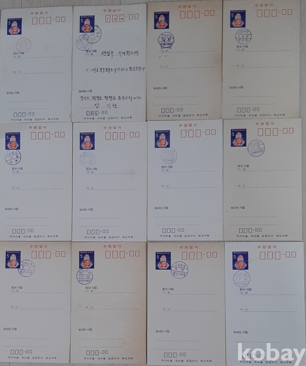 1. 1975년경 5원 우편엽서 12매(사용 1매, 미사용11매)-우편요금 인상으로 전국 각우체국의 요금10원 완납소인이 찍힌