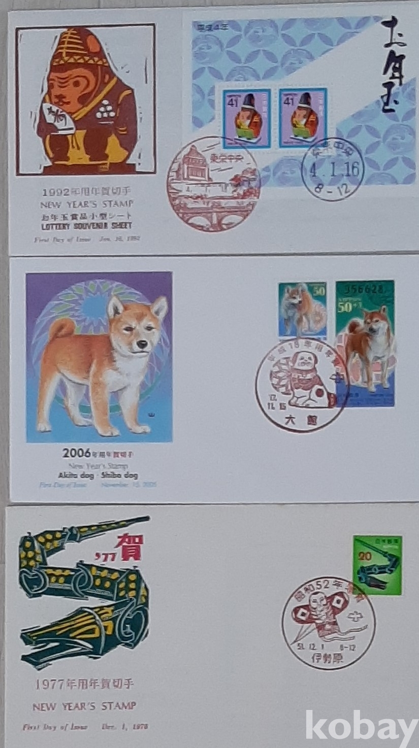 2. 1977년 일본 사용제 연하엽서, 1992년 일본 사용제 연하엽서, 2006년 일본 사용제 연하엽서 총3매