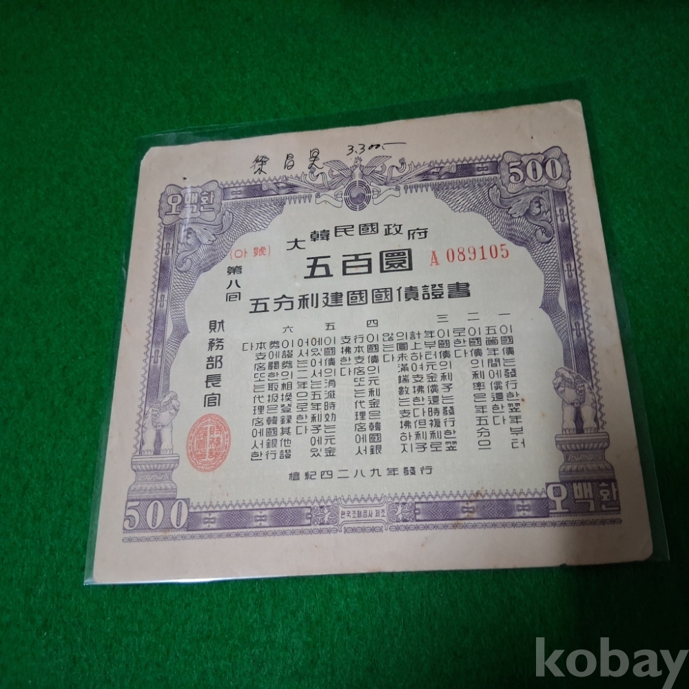 대한민국 건국채권 8회 500환 사용제