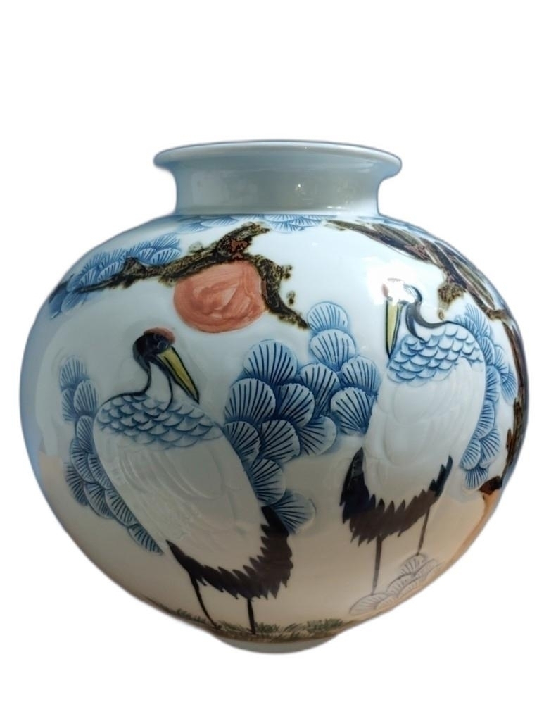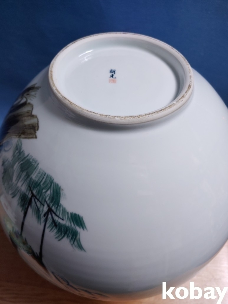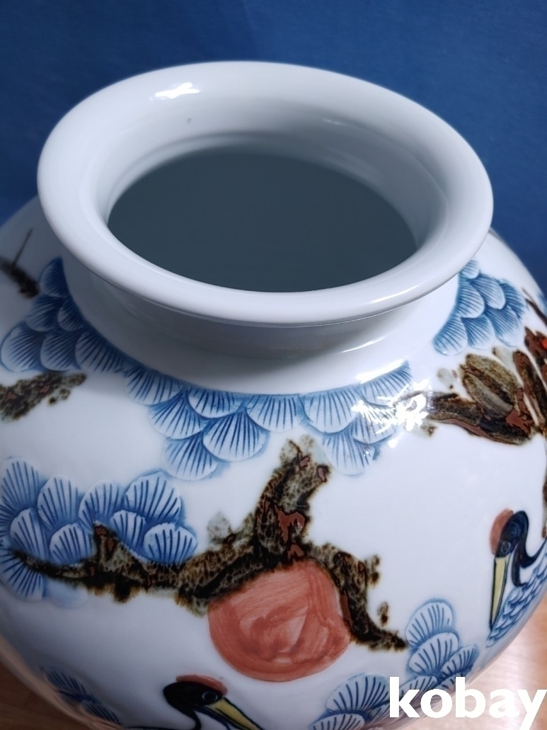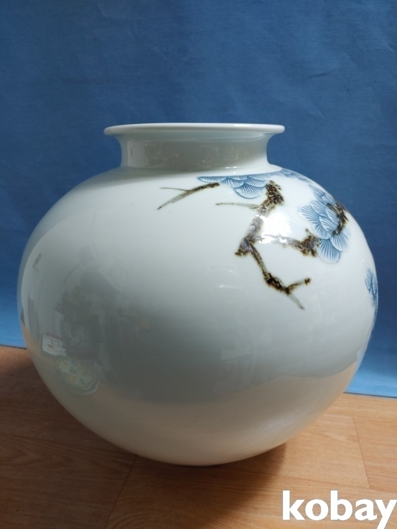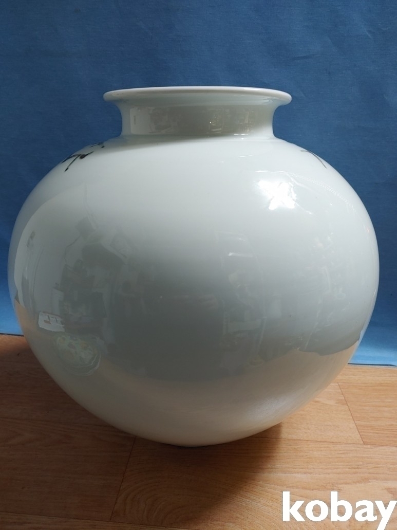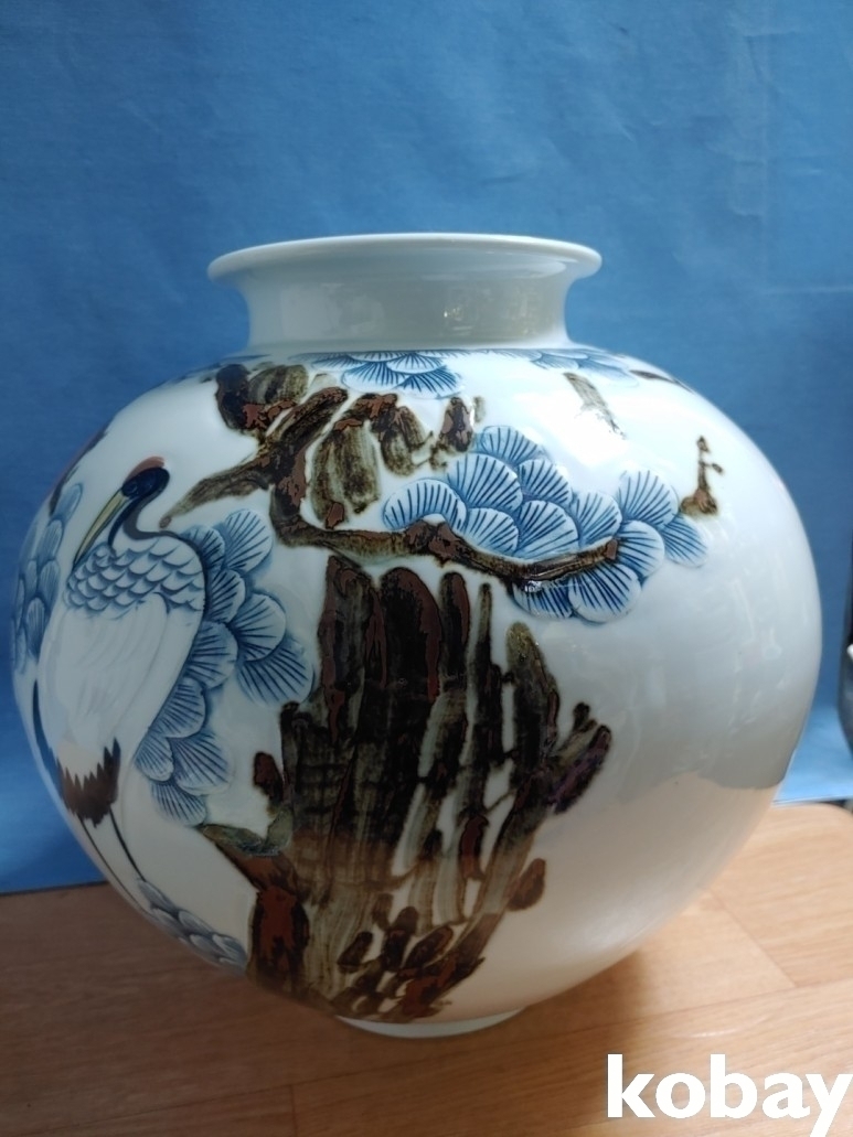 철화로 소나무와 학문양이 돌출로 표현된 대형 달 도자기 입니다.