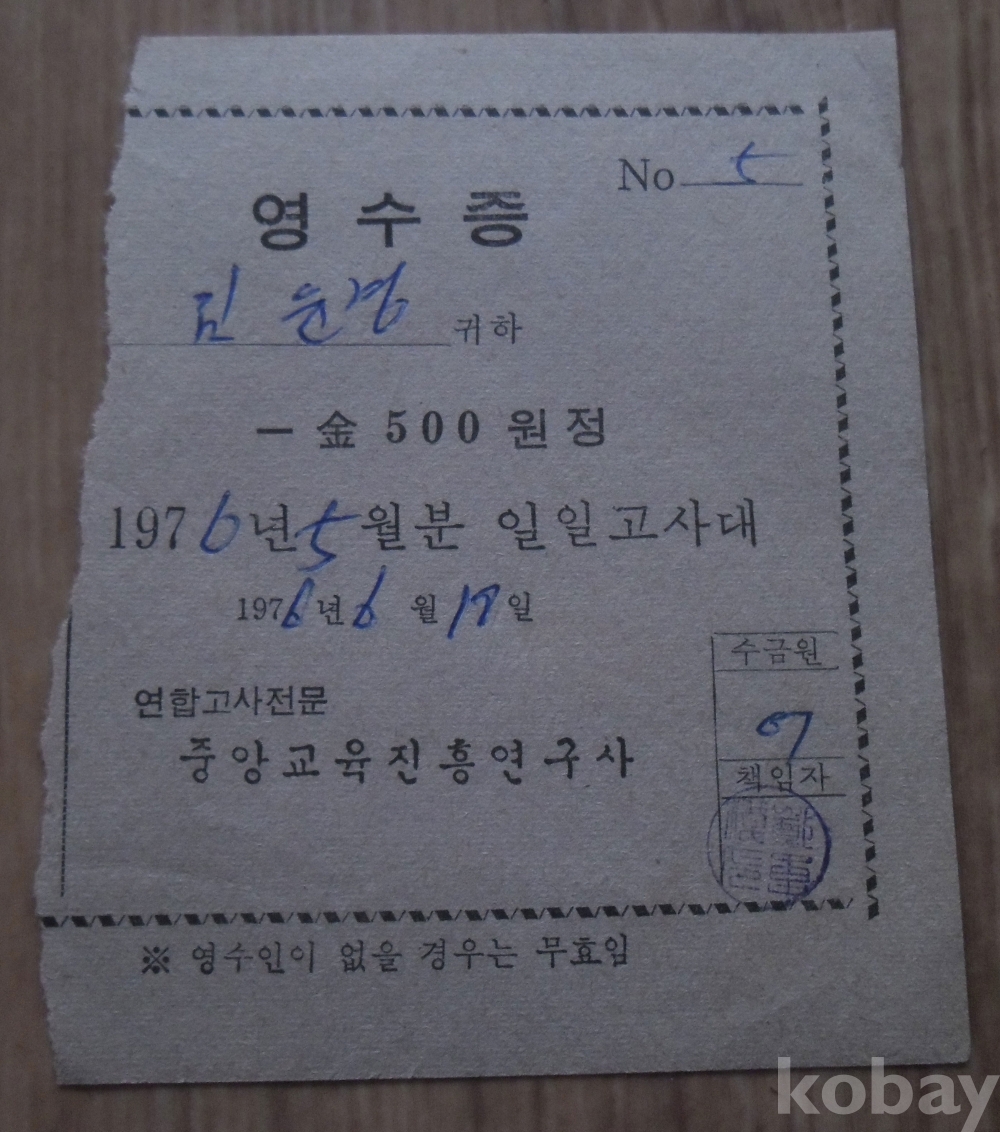 1976년 중앙교육진흥연구사 일일고사대 영수증