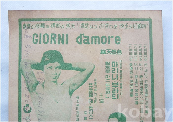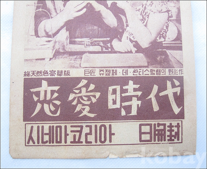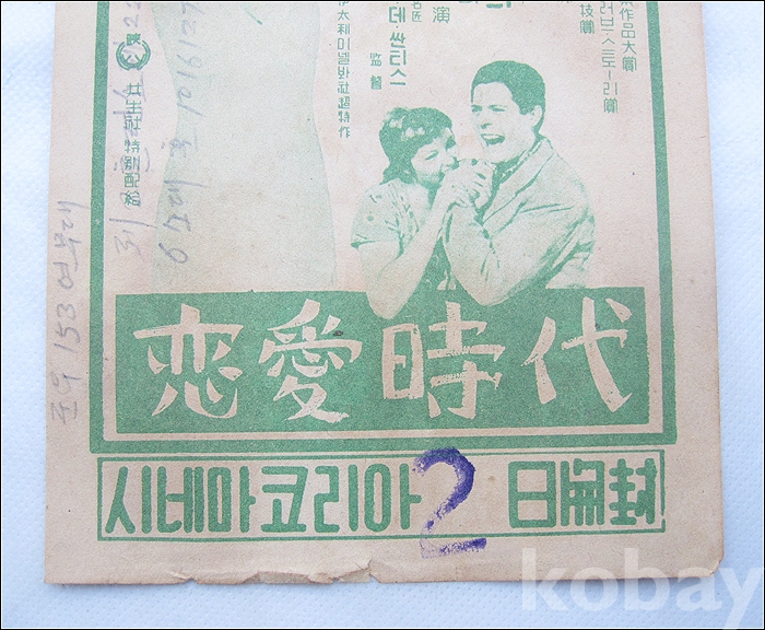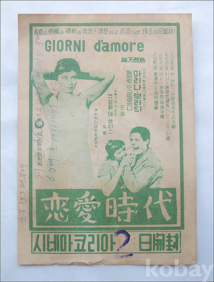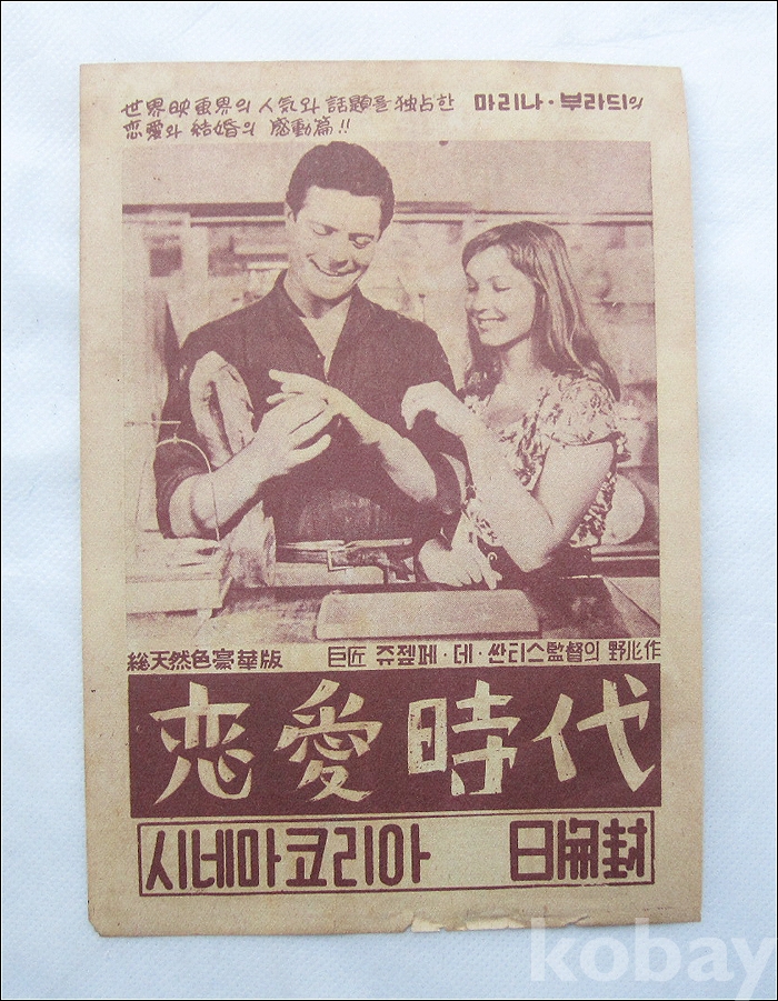 가로 : 약 12.5cm 세로 : 약 18.2cm 양면 인쇄 1장입니다. 연애시대는 1954년 명감독 쥬세페 데 산티스(Giuseppe De Santis)가 연출한 이탈리아 청춘 로맨스 영화(원제 : Giorni d'amore)로 우리나라에서는 1957년에 개봉했습니다. 시네마 코리아 극장은 1956년 중구 코리아나호텔 자리의 조선일보 사옥내에 개관한 극장입니다. 1969년 코리아나호텔을 신축하면서 없어졌습니다.