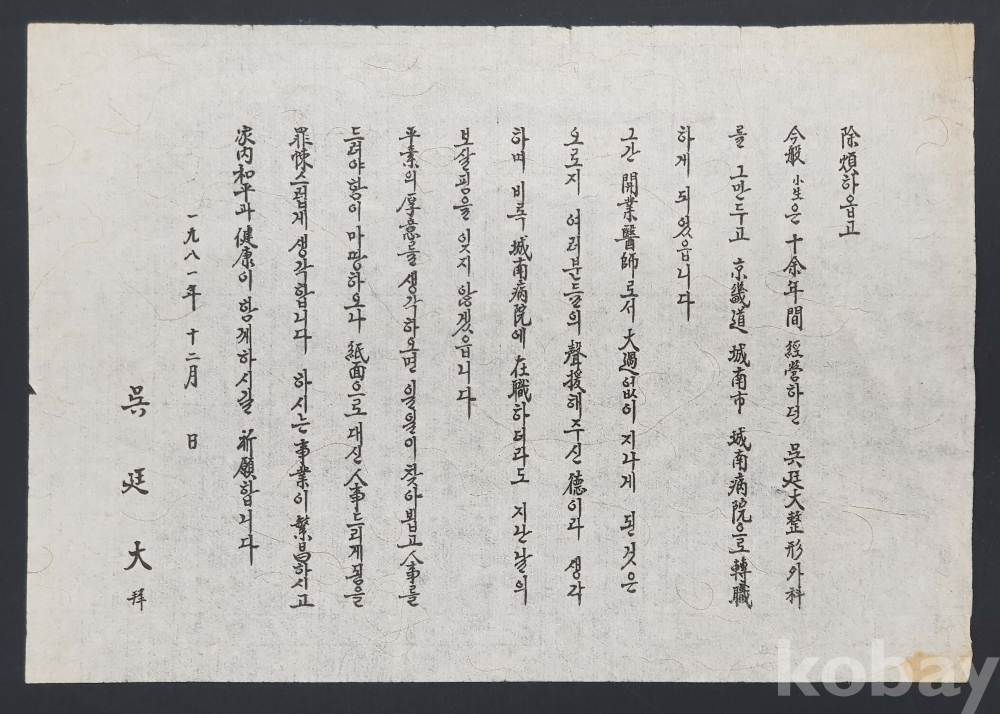 **** 1981년 12월 城南病院 院長 吳廷大 인사장