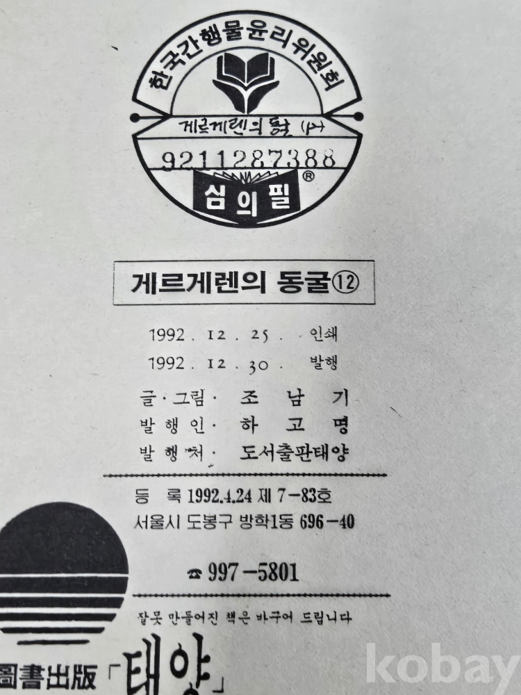 80-90만화방 ==청소년 만화 오철드 극화 / 조남기 글.그림 = 게르게렌의 동굴 12권 완질
