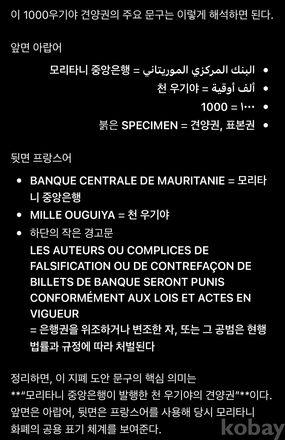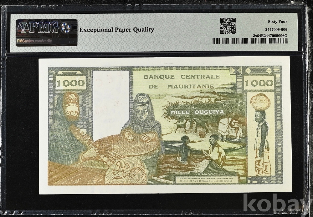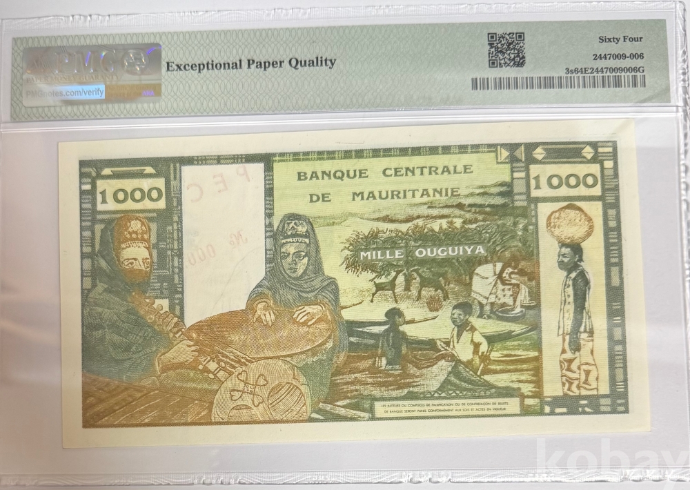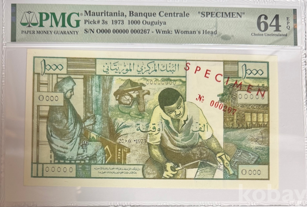 이 1000우기야권은 모리타니가 1973년에 자체 통화인 우기야를 도입한 직후의 첫 세대 지폐에 속한다. 당시 모리타니는 서아프리카 CFA 프랑 체계에서 벗어나 독자 통화 체계와 통화 주권을 강화하려 했고, 그 결과 1973년에 100·200·1000우기야 지폐가 처음 발행되었다. 그래서 이 지폐는 단순한 고액권이 아니라, 독립 이후 국가 정체성과 경제 자립 의지를 상징하는 초기 화폐 디자인으로 볼 수 있다. 이후 우기야 체계는 오랫동안 유지되다가 2018년 새 우기야 체계로 개편되면서 이 초기 시리즈는 역사적 수집 대상으로 자리 잡았다.