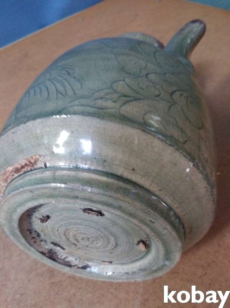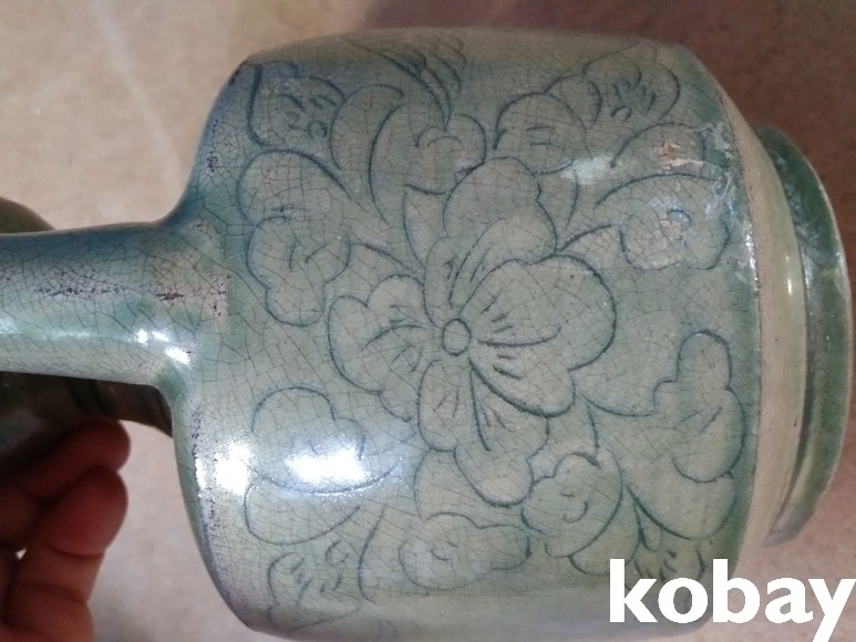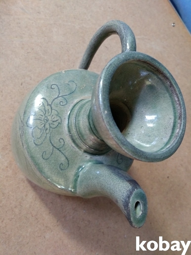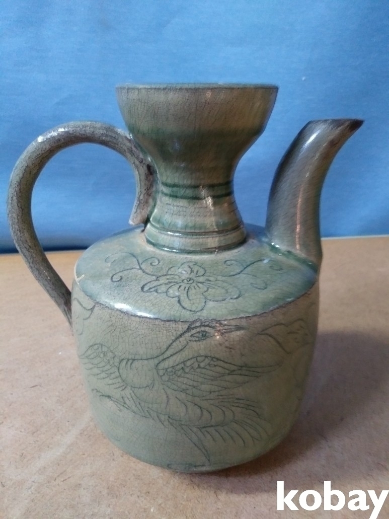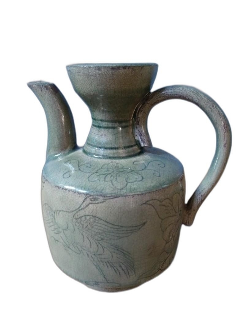 학과 꽃 문양이 있는 주전자 도자기 입니다.