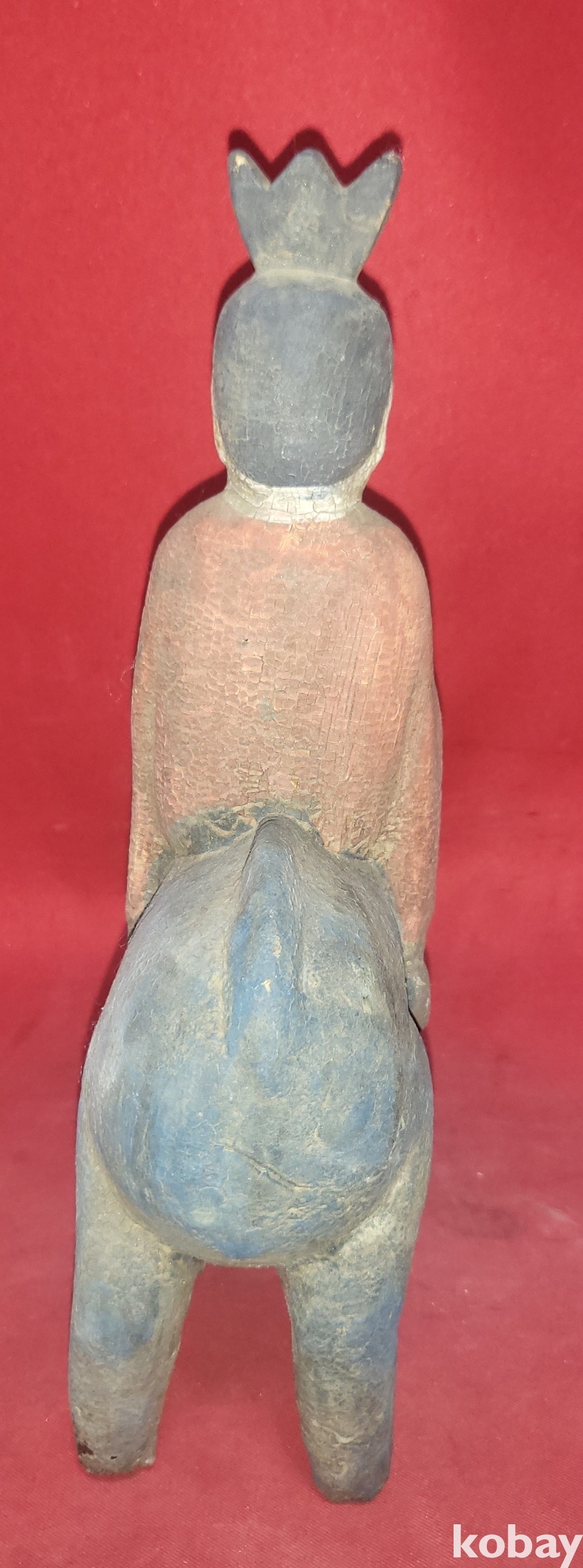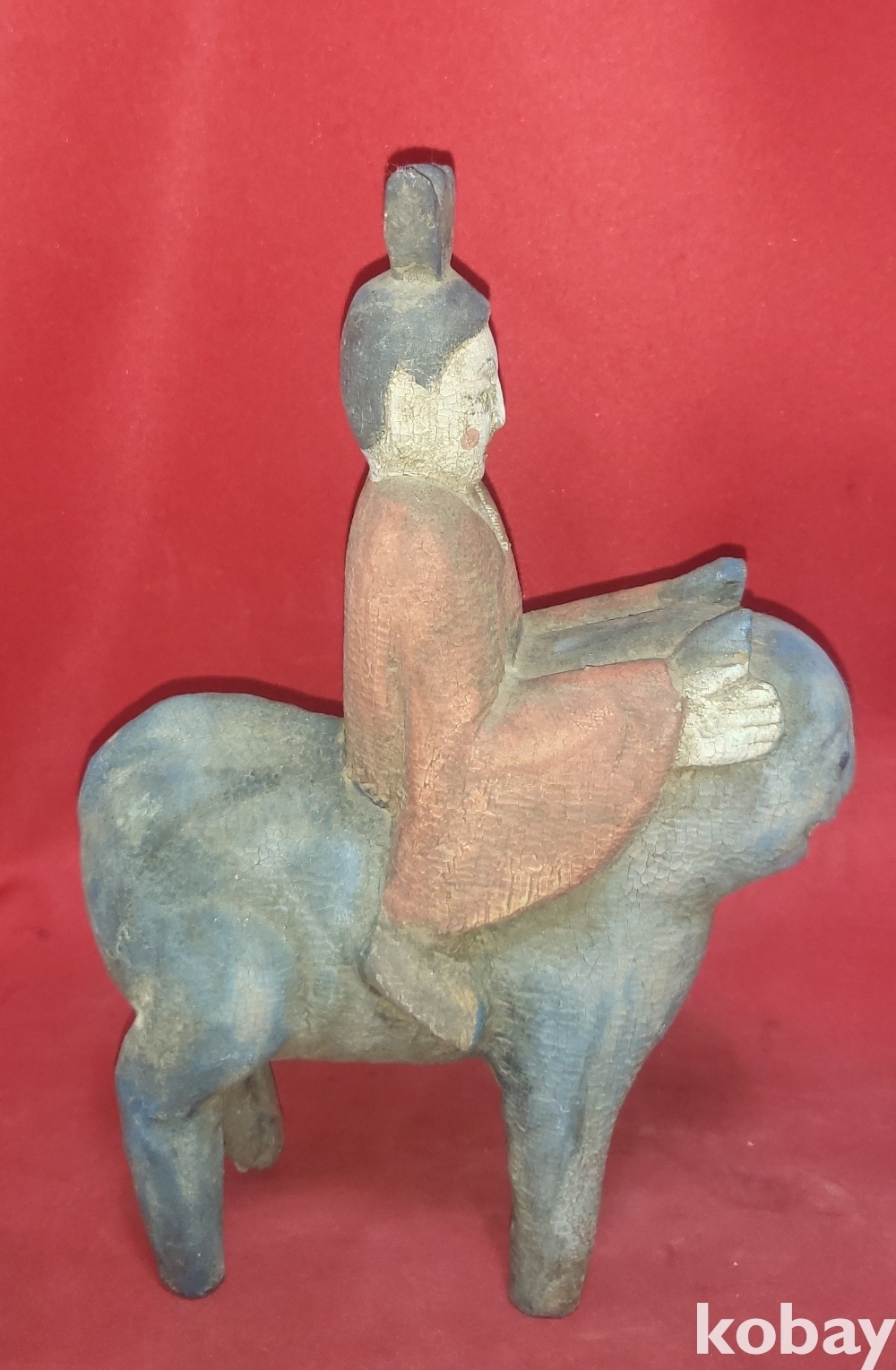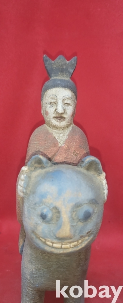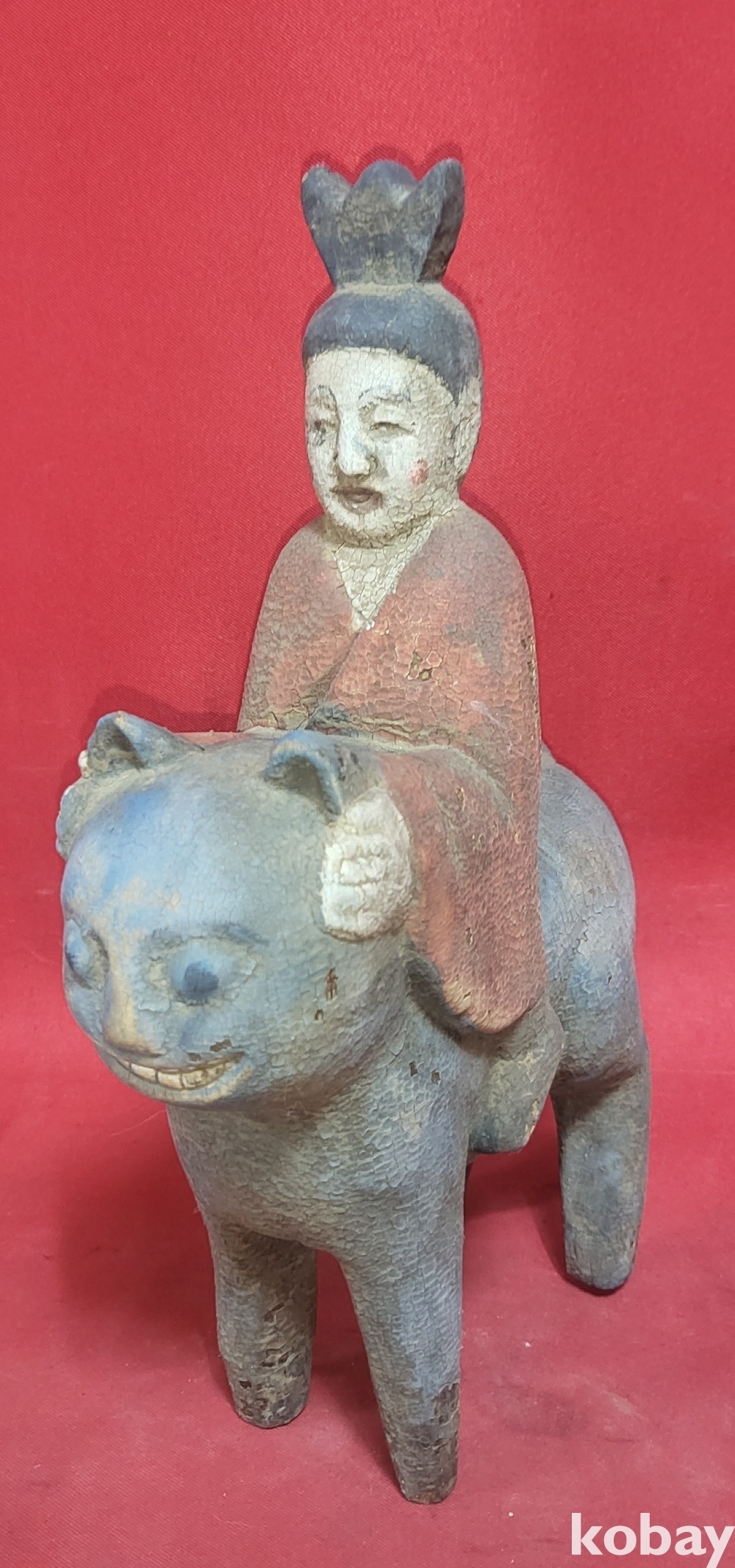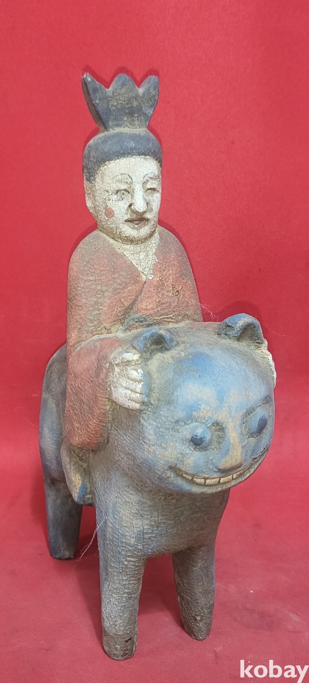 높은 연대를 갖춘 나무에 당채로 채색된 인물 문양 조각품입니다,
