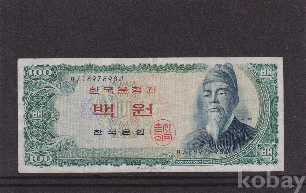 - 한국은행 1965년 세종 백원 71포인트 사용제 지폐