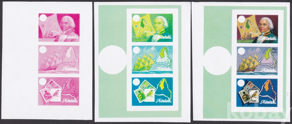 (하늘천) 아이투타키 Sc354 Ausipex 84 세계우표전시회, 뉴사우스웨일즈 주지사 윌리엄 블라이 (1754-1817), 범선 바운티호, 컬러 트라이얼 프루프, 에세이3종