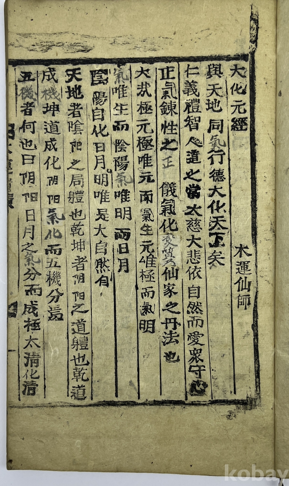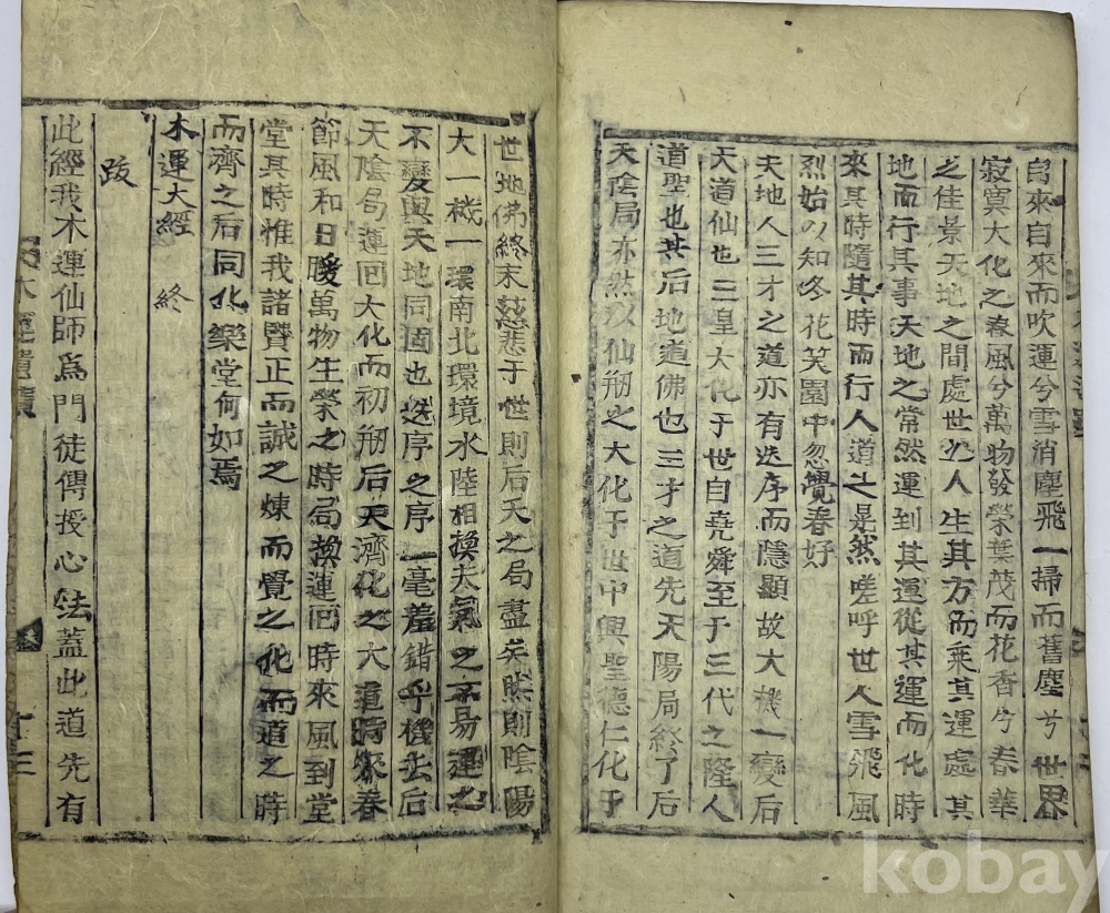 설 명 | 목운(木運) 윤진(尹珍, 1905~1950)이 1948년에 세운 대화신도(大化神道)의 경전 ‘목운대경(木運大經)’ 목활자본이다. 이 종교의 경전에 대해 현재까지 알려진 유일한 자료는 1976년 오열균이 편찬한 ‘목운대경’뿐이였다. 이 경전의 구성은 대화원경(大化元經), 단화경(丹化經), 신화경(神化經), 도화경(道化經) 순으로 되어 있다. 1905년 강화도에서 출생한 목운 윤진은 1948년 충남 용운암에서 개도(開道)하고 전도식을 열어 7명에게 도를 전수했다고 한다. 그의 제자 춘당(春堂) 이응부(李膺溥)가 1952년 이 책을 간행하면서 쓴 발문에는 1950년 선사가 돌아가시고 곧바로 자료를 수집하고 간행하고자 하였으나 세상의 기운이 지극히 어려운 때(한국전쟁)를 만나 2년이 흘러서 간행했다고 한다. 다만 경제적으로 매우 어려워서 간행부수가 수십부에 불과하여 못난 제자의 허물을 탓하고 있다. | |||||