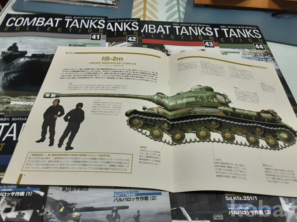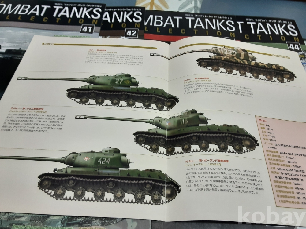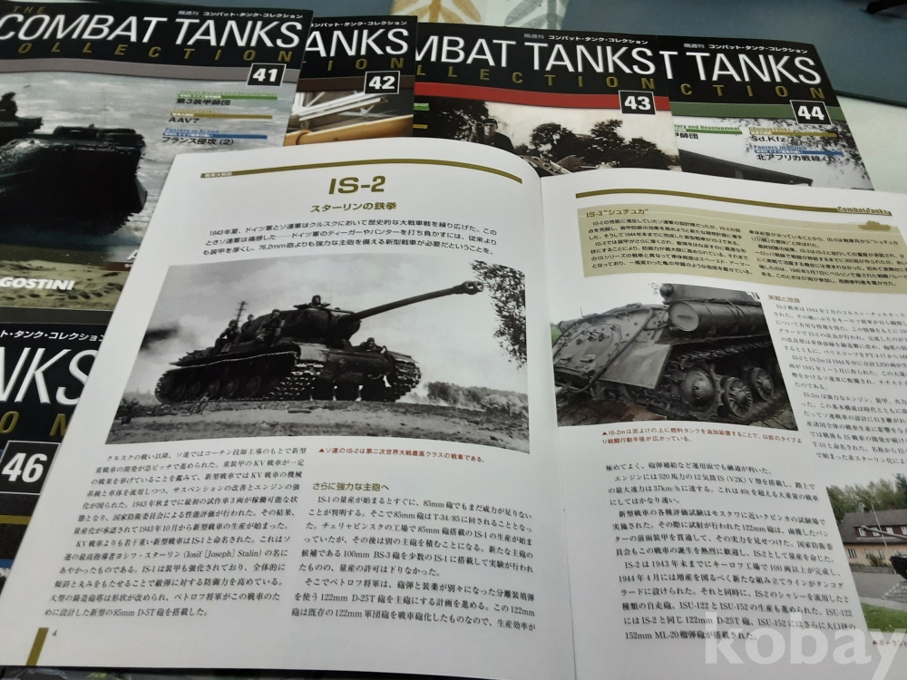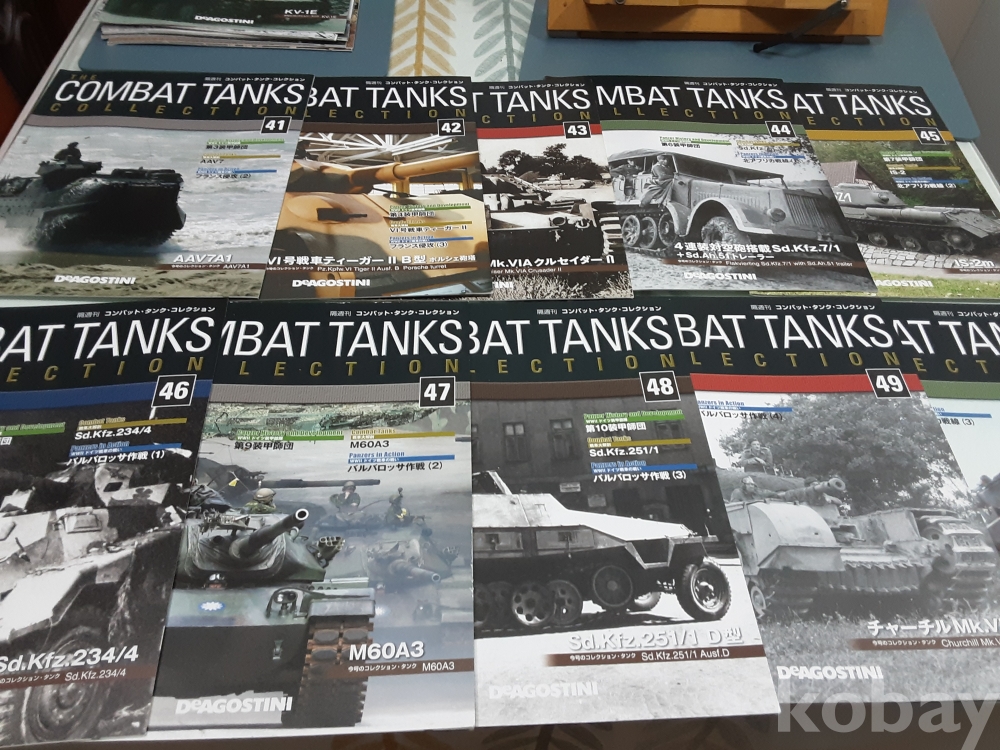 1. 데오고스티니(DeAGOSTINI) 전투 탱크 컬렉션은 다양한 국가의 제2차 세계 대전 및 냉전 시대를 대표하는 탱크들을 정교하게 재현한 1:72 스케일의 모형 120종 시리즈로 각 모델에는 디스플레이 케이스, 탱크모형과 잡지가 함께 제공된다. 전세계적으로 수집가들에게 인기가 많은 데오고스티니(DeAGOSTINI) 탱크 모델 해설서인 잡지 전 120종 판매. 41. 수륙양용 장갑차 AAV7A1 42. 6호전차 타이거 2 B형 43. 순항전차 크루세이더 44. 4연장 대공포 Sd. Kfz 45. 스탈린 전차 2m 46. Sd. Kfz 234/4 47. M60A3 48. Sd. Kfz 251 하노마그 49. 처칠 전차 50. 2호전차 F형