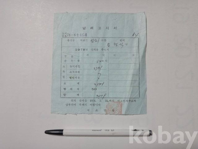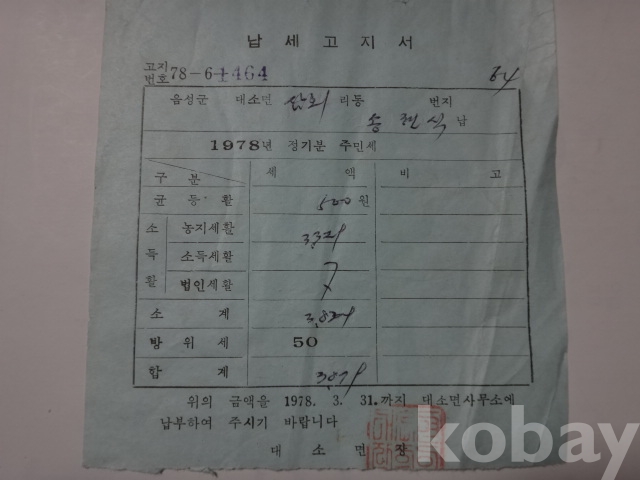 음성군 대소면장 - 주민세 납세고지서 (1978년)