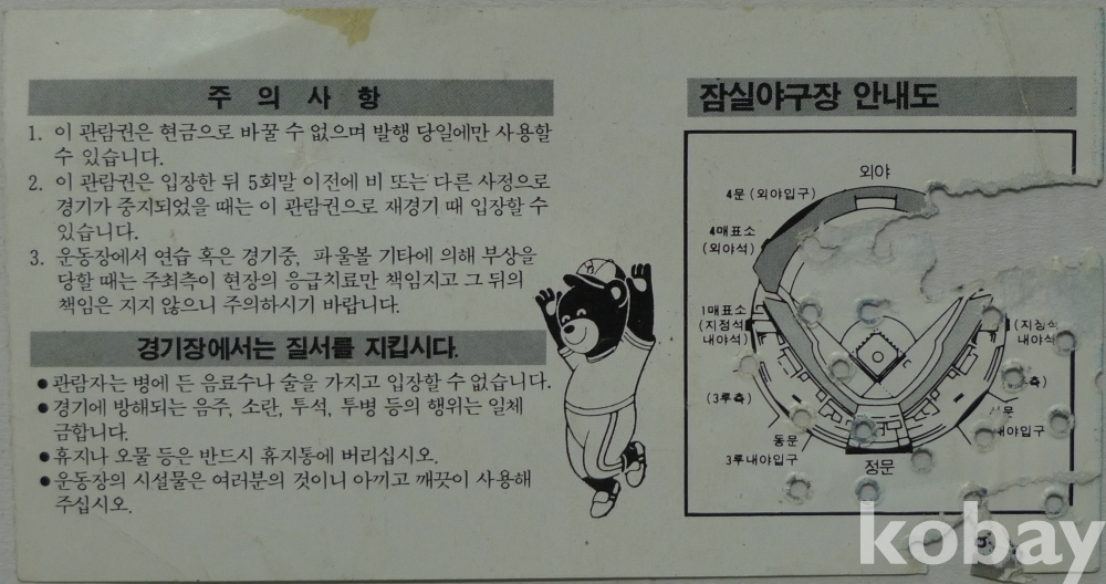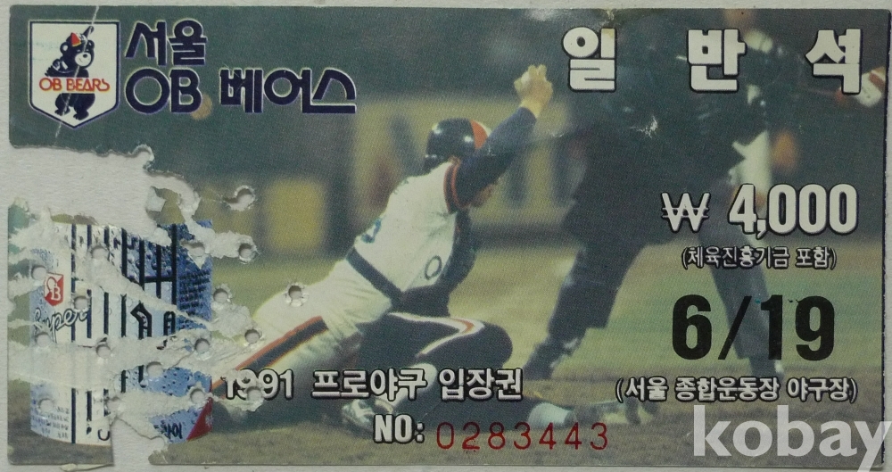 1991년 프로야구 OB 베어스 입장권 - 앞면 김태형 선수(현 롯데 자이안츠 감독) -