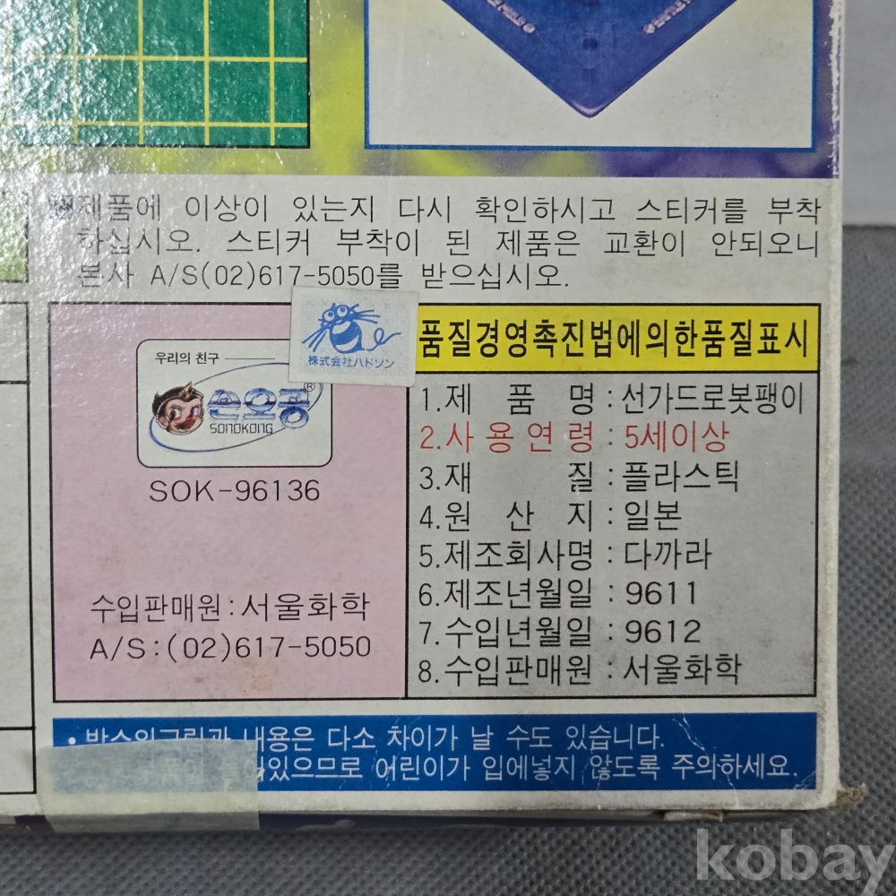 96년 손오공 완구 == 지구용사 선카드 == 미사용 박스 == 선가드로봇팽이 9호