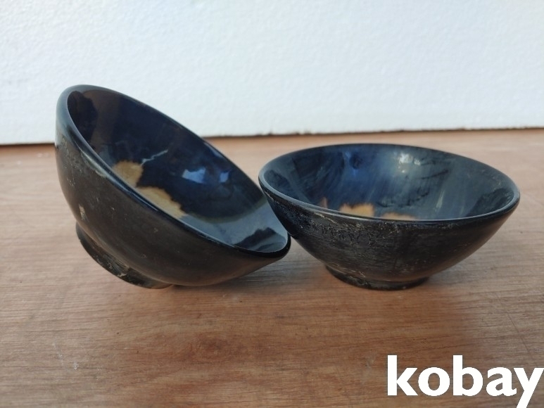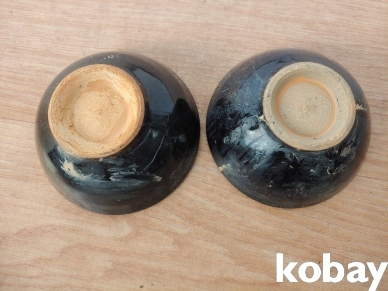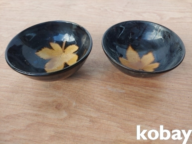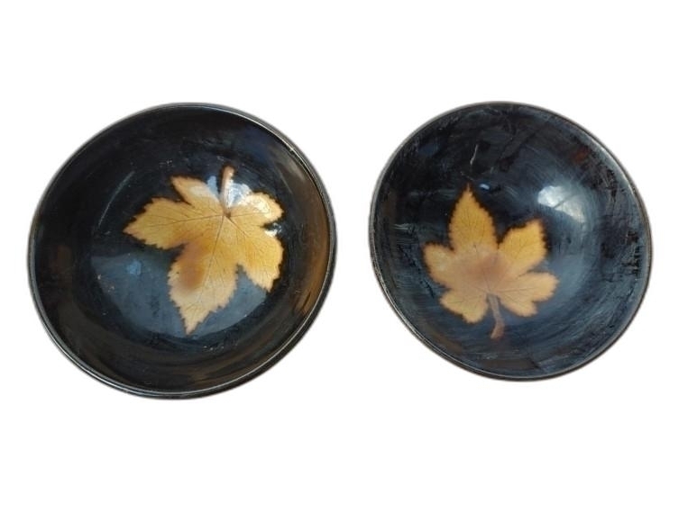 나뭇잎이 있는 흑유 다완 도자기 2개 입니다.