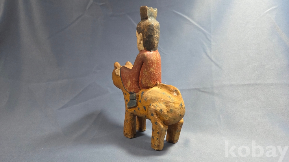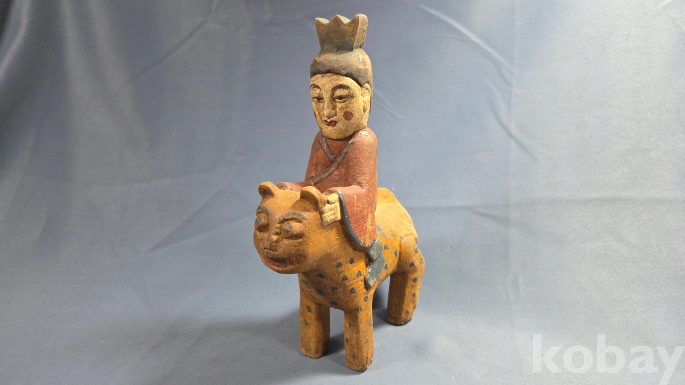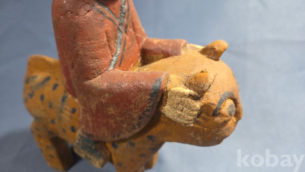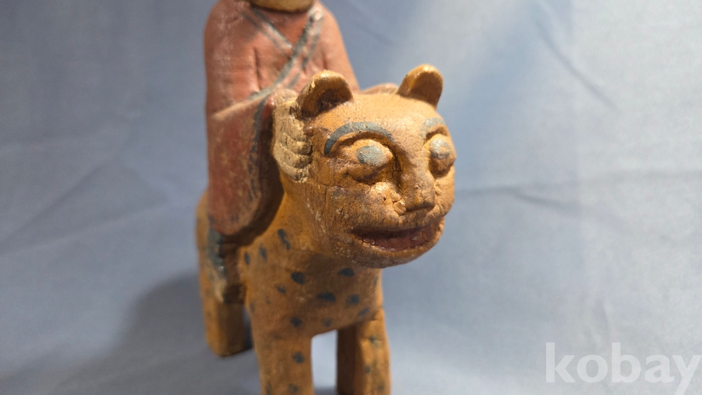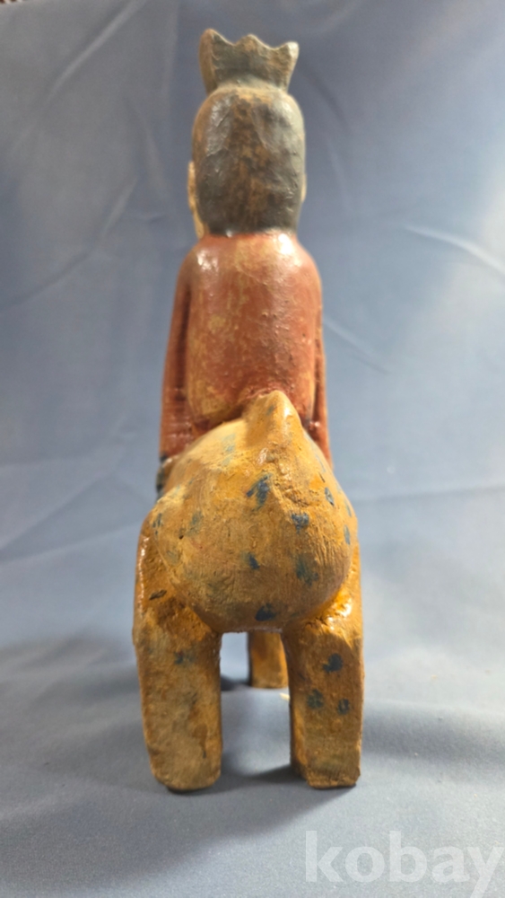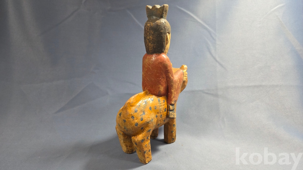 동물위에 인물이 올라타 있는 모습의 나무조각품 입니다.