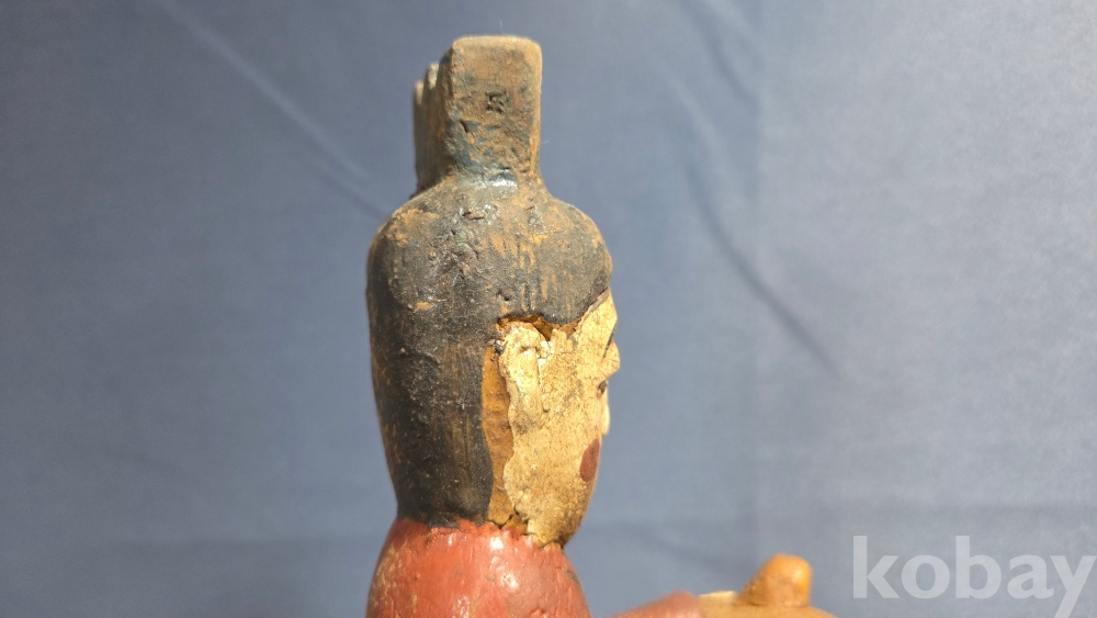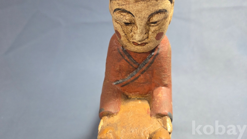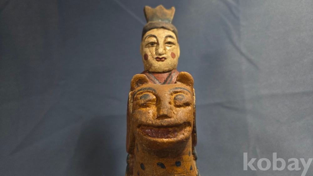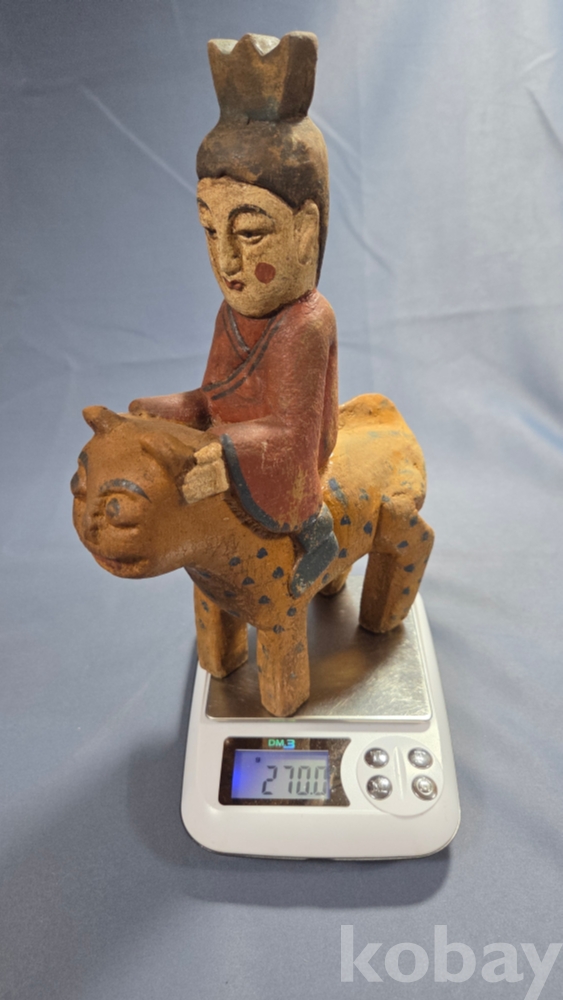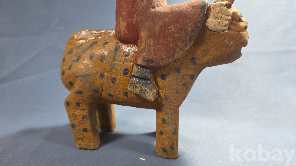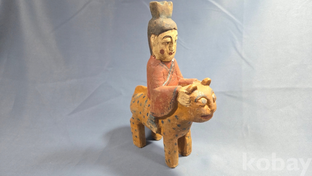 동물위에 인물이 올라타 있는 모습의 나무조각품 입니다.