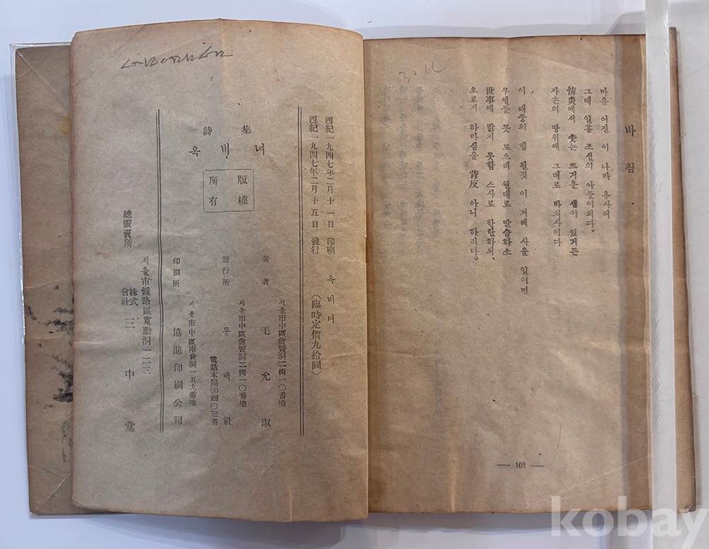 물 품 명 | <취향지가> [78] 1947년 발행, 정홍거 장정 모윤숙의 제2시집 [옥비녀] 초판본 1책 | |||||