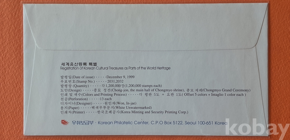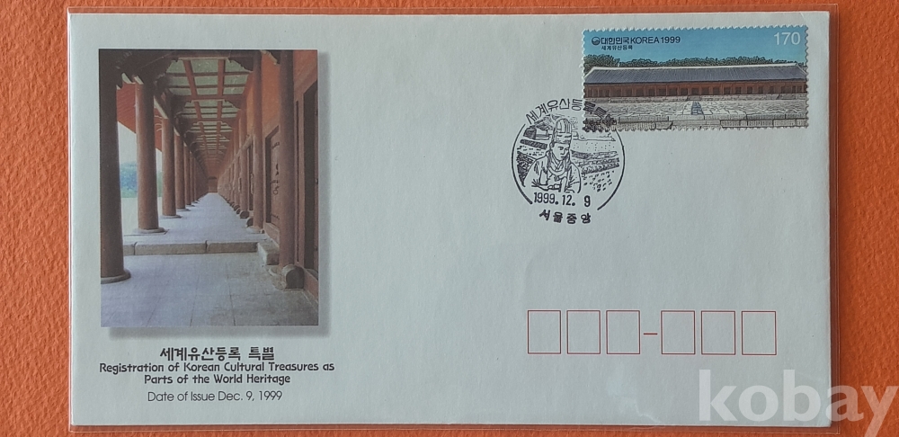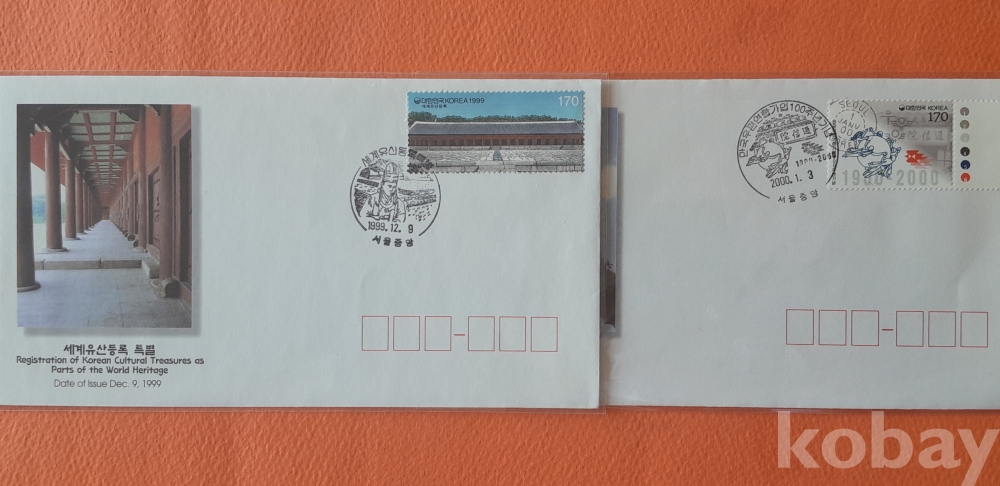 2001년 발행 세계유산등록 특별 종묘 외 1종 초일봉피 입니다.