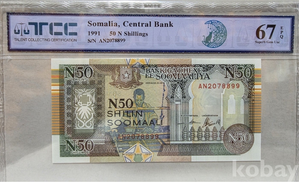 -1991년 소말리아 50실링 지폐 TCC67 등급 입니다.