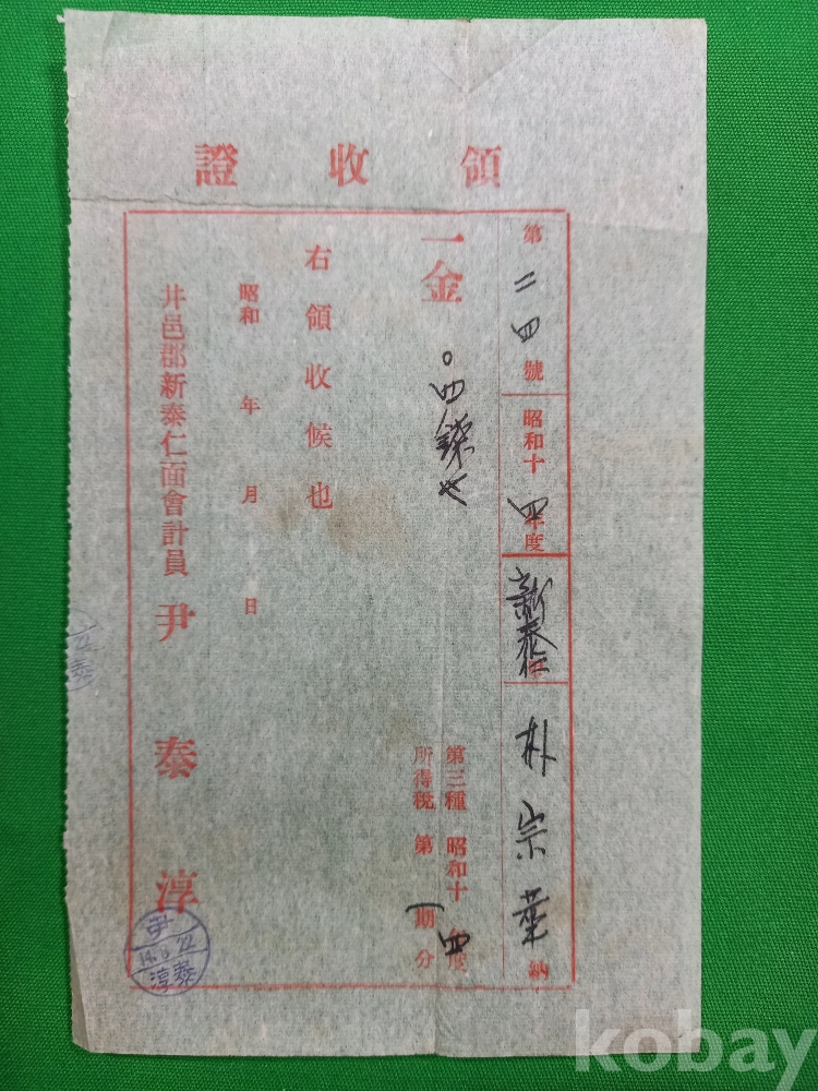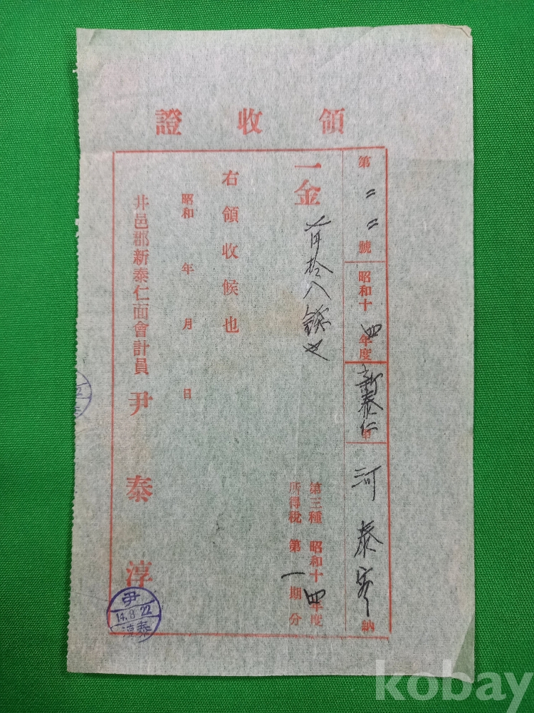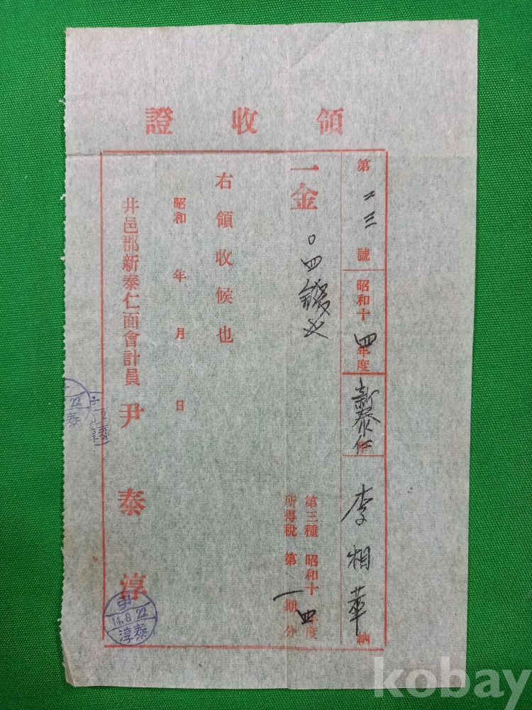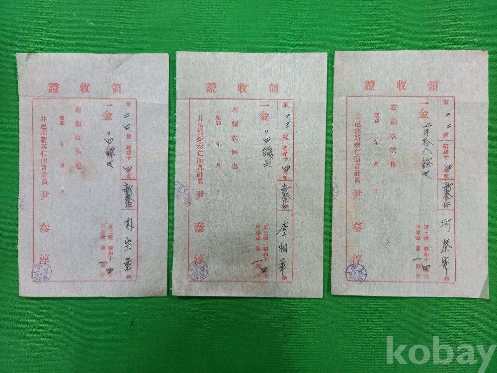이 영수증은 일제강점기(1940년대) 당시 전라북도 정읍군(현 정읍시) 신태인면에서 발행된 영수증(領収証)들입니다. 당시 신태인면사무소의 회계원이었던 윤태순(尹泰淳)이라는 인물이 발행한 것으로, 당시 지역 사회의 세금 수납 체계와 생활상을 보여주는 역사적 자료입니다.