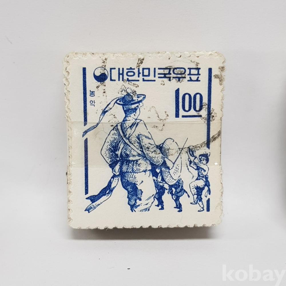 - 1963년 새 원화 농악 1원 보통우표 일부인 미확인 사용제 우표 약 100매 묶음