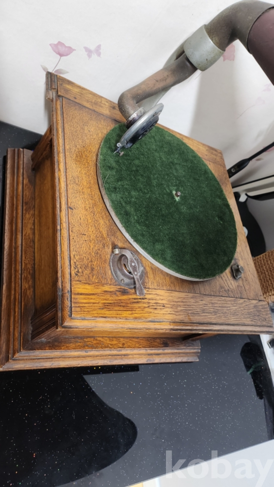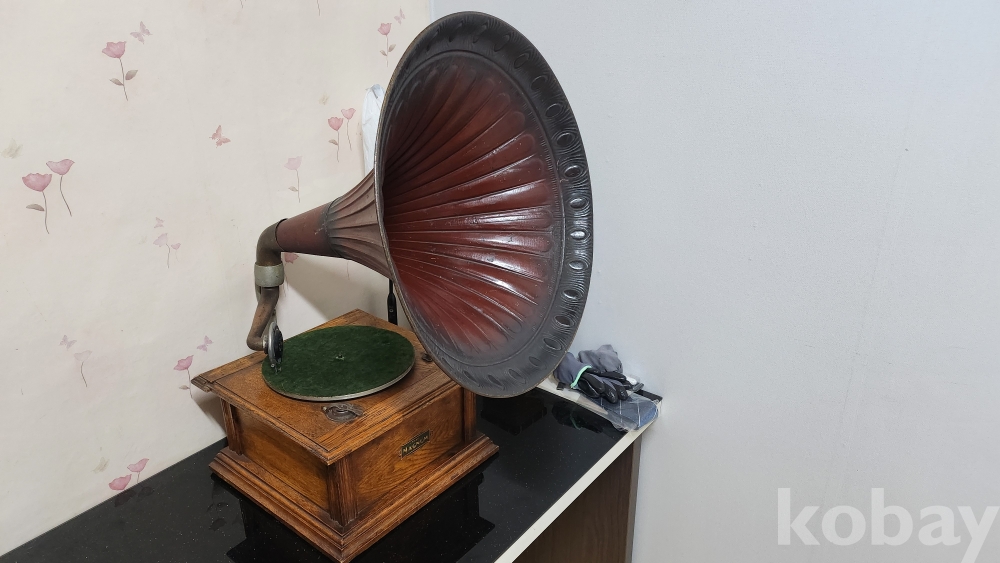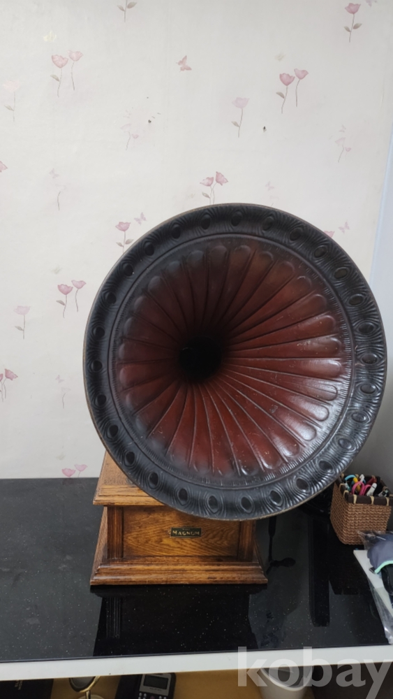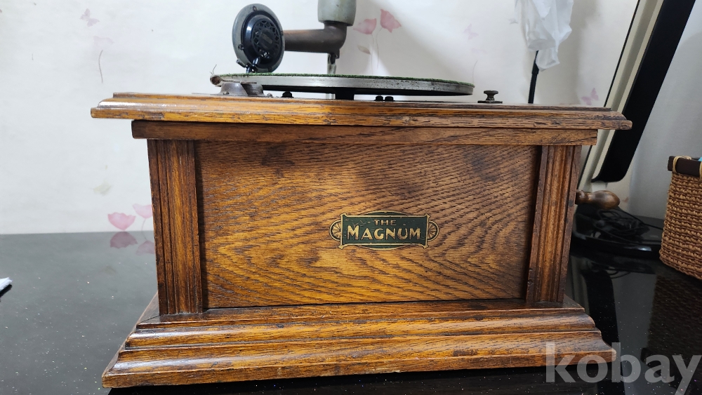 1910년경 제작된 외부 나팔형 축음기(Horn Gramophone)입니다. 본체 전면에 MAGNUM'이라는 브랜드, 영국이나 유럽 지역에서 유통되던 중급형 모델