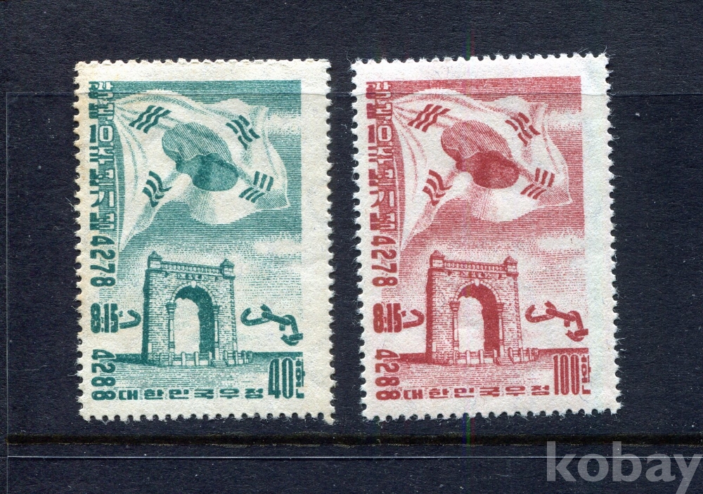 - [우표] 1955년 미사용 광복 10년 2종 (All MNH : Mint Not Hinged : 뒷면 힌지자국없이 깨끗한 상태)