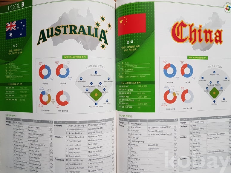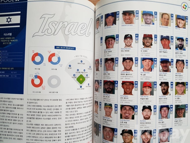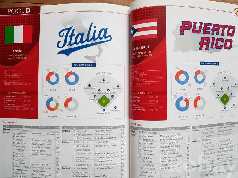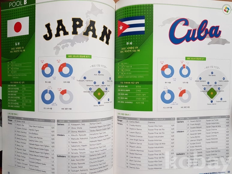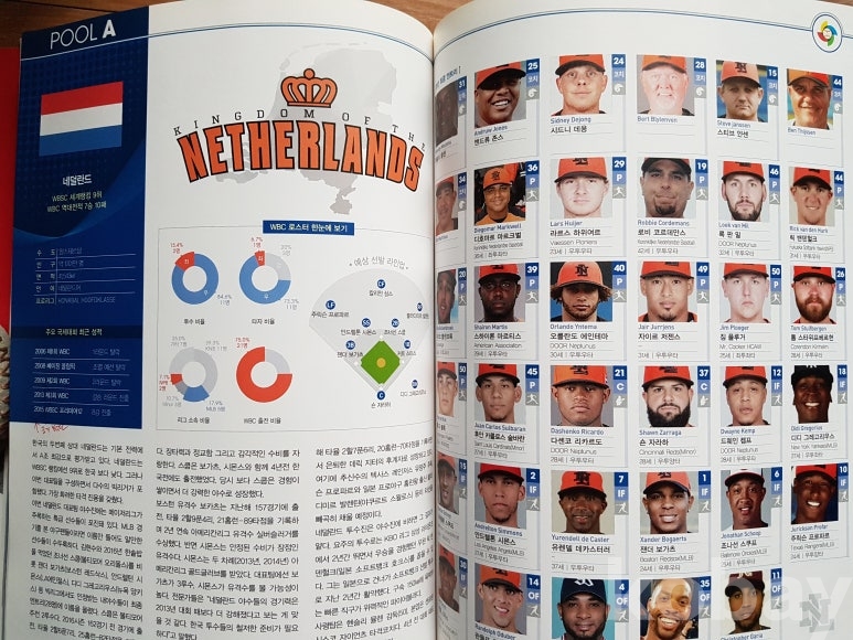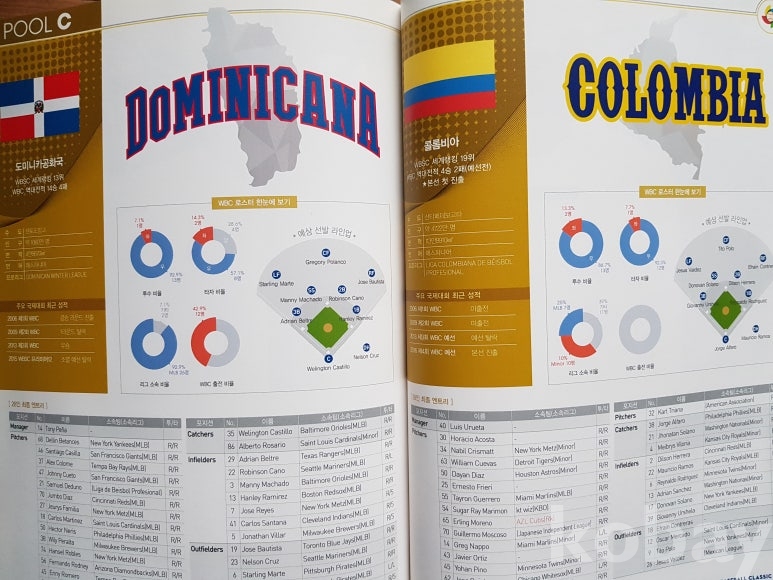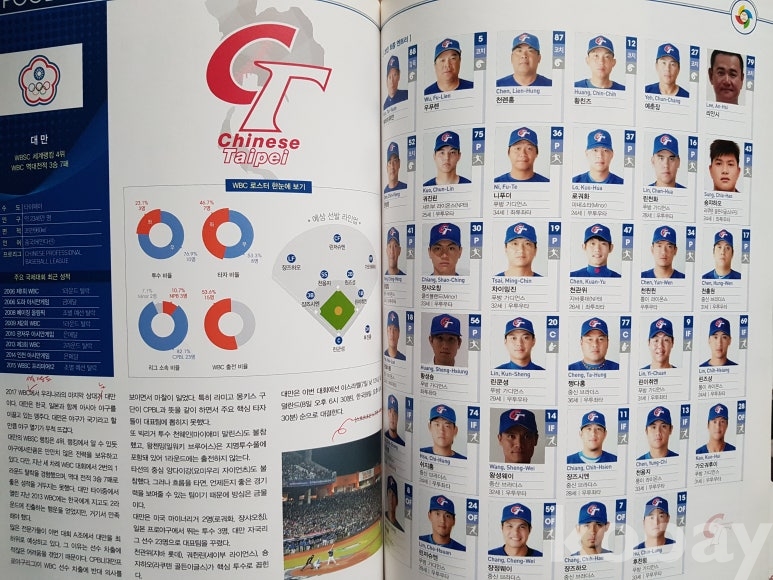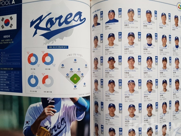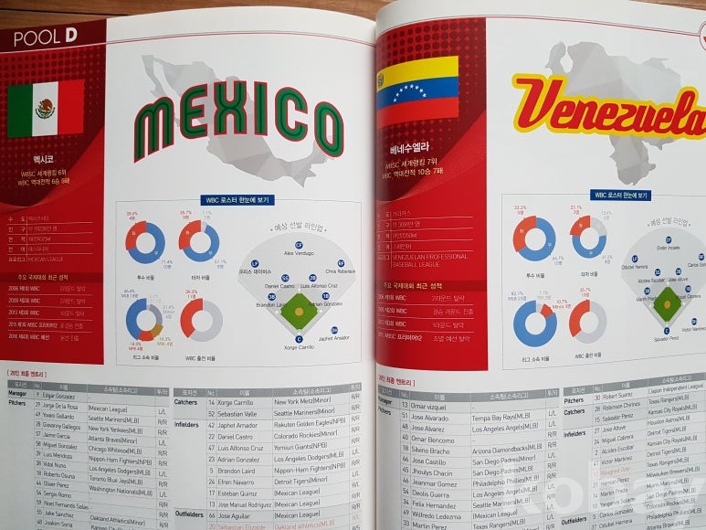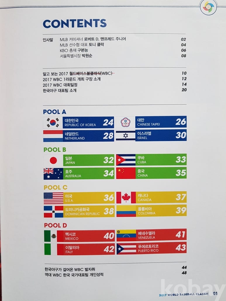 설명: 이 팬북은 2017 월드 시리즈 서울 대회 A조: 대한민국 대만 네덜란드 이스라엘 , B조: 일본 쿠바 호주 중국 , C조: 미국 카나다 도미니카공화국 콜롬비아 , D조: 멕시코 베네수엘라 이탈리아 푸에르토리코 , 총 16팀 참가 한국야구국가대표팀 과 4개조 경기 팬북으로 다른조의 국가대표팀 사진도 올려봅니다.