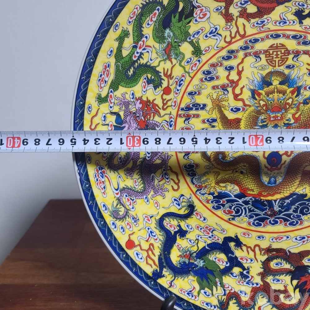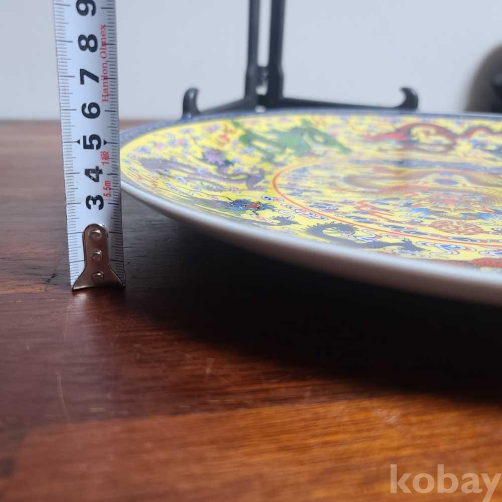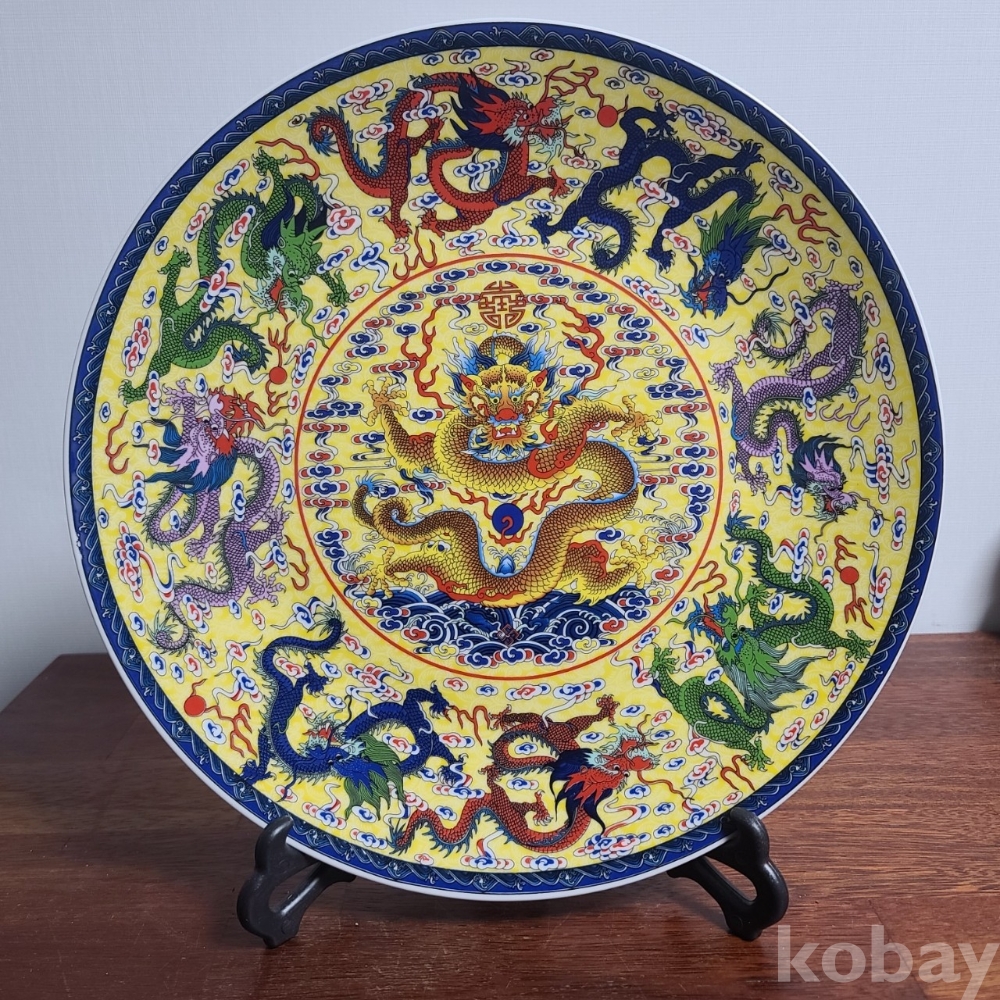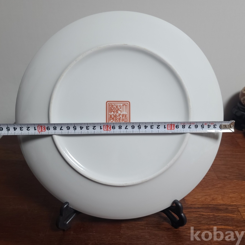 그림이 화려하게 전사된 도자기 접시입니다. 미사용 작품으로 좌대와 함께 제공되며 사이즈와 무게 모두 장식용으로 두고 보시기에 손색없는 작품입니다
