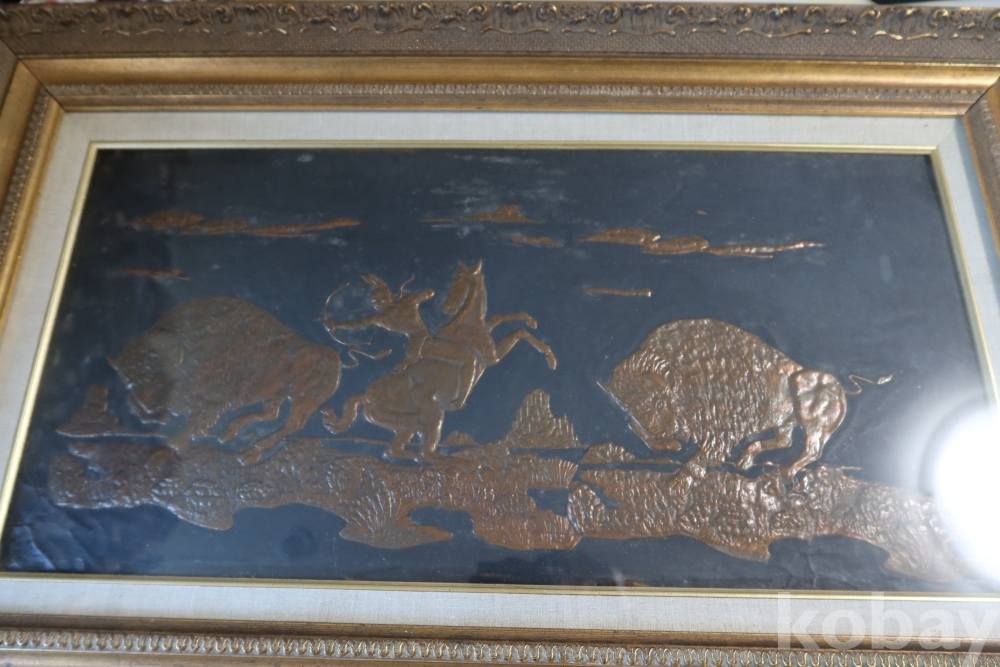 들소 사냥 구리 금속 공예품 이며 고급 액자를 가진 명품 이며 액자 등등 고 태미를 가진 명물 임니다 금속 미국 구입 인 명품 임니다 빛 반사가 보임니다 낙찰시 유리 없이 배송 함니다