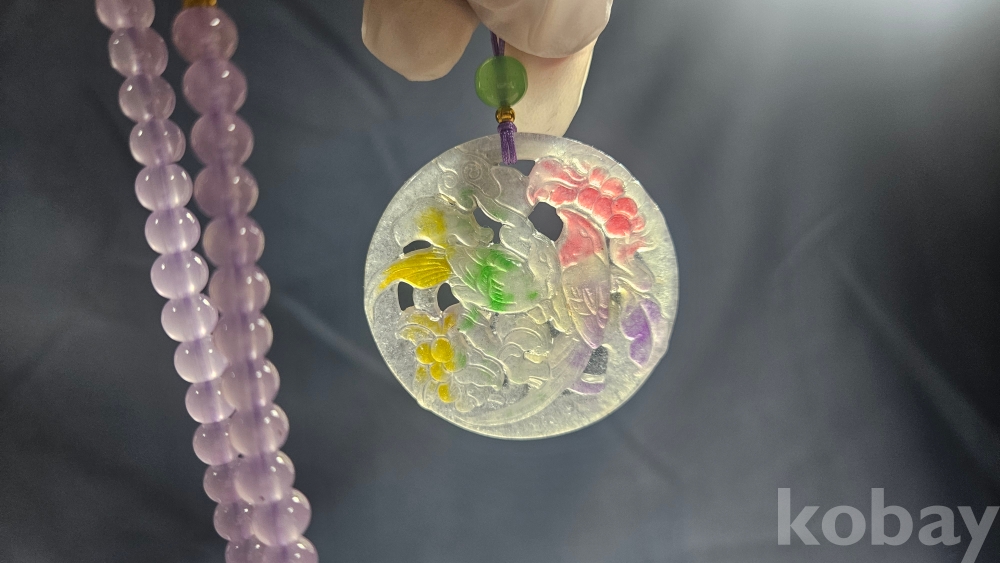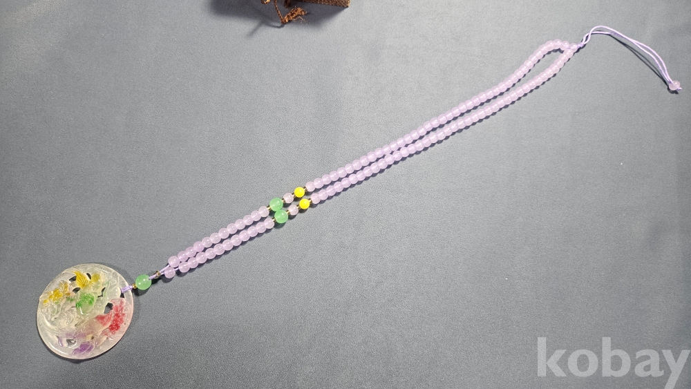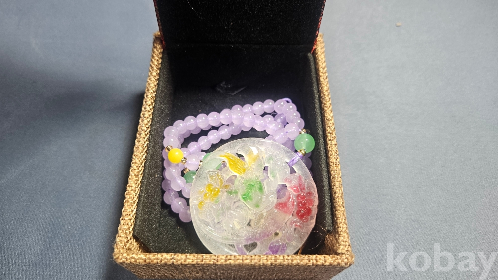 팬던트에 새와 꽃문양이 조각 되어있는 옥 목걸이 입니다.