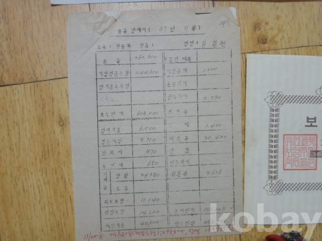 충청남도 농촌진흥원 직원 - 자료 일괄 (봉급명세서, 보험증권, 편지 등, 1987년)