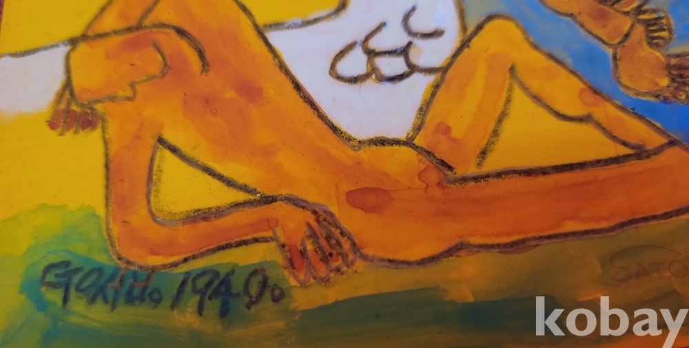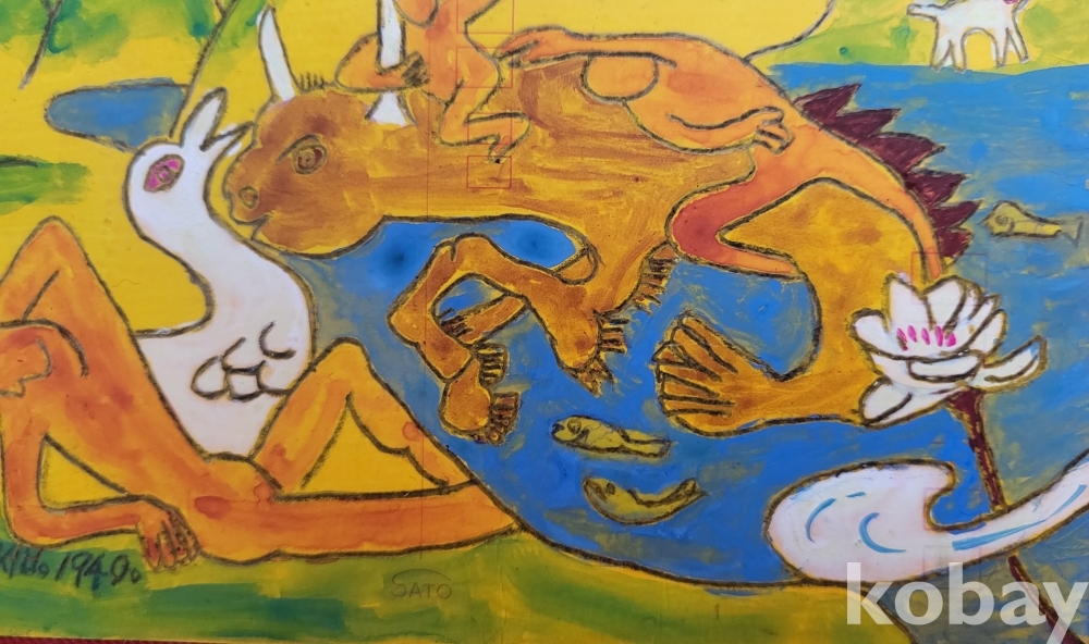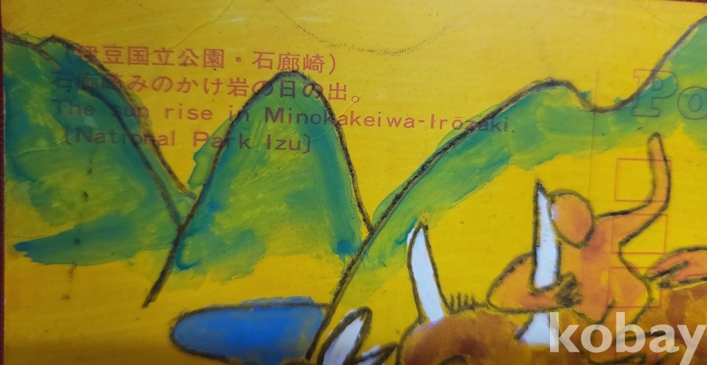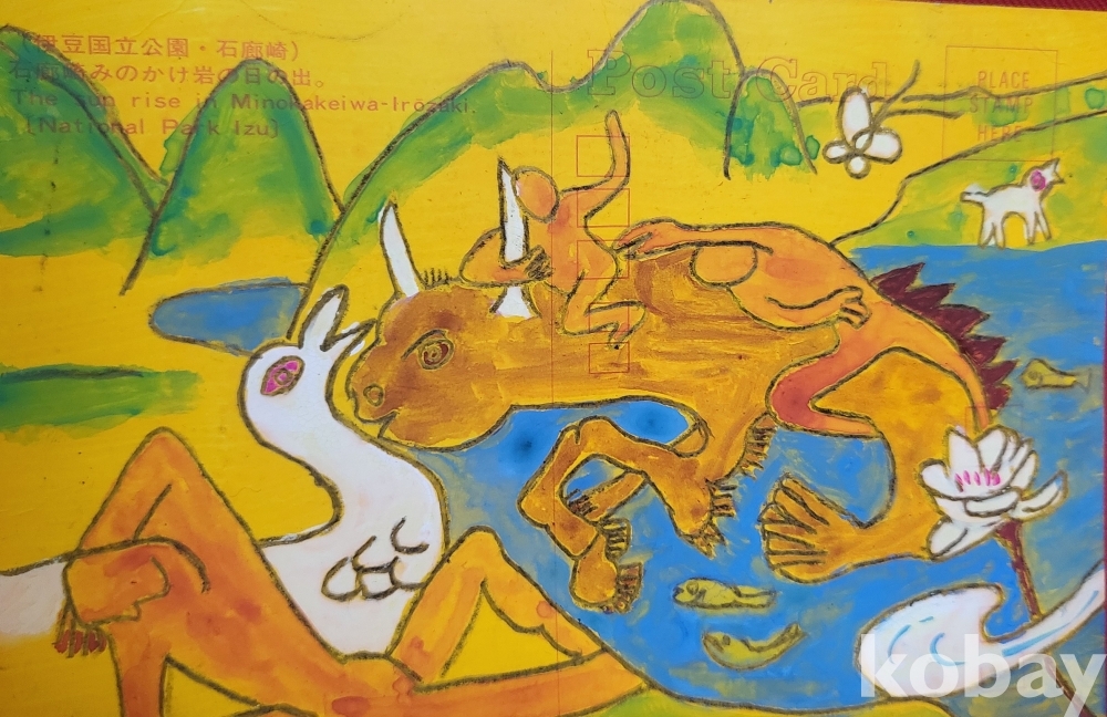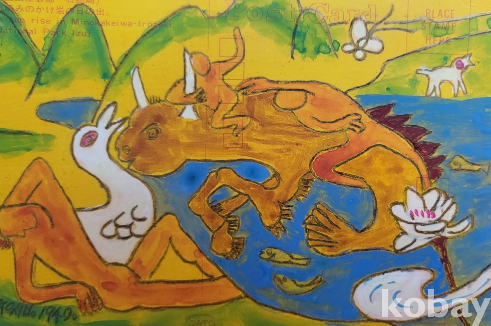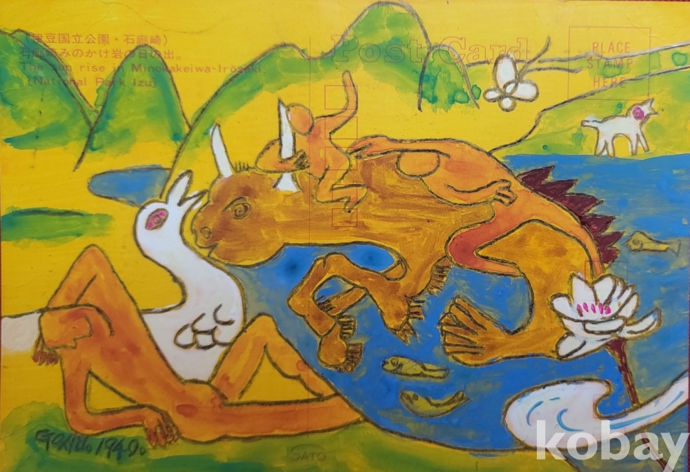 1940년도 우편엽서에 그린 GO섭 사인이 보이는 동물과 사람 산,오리,연꼬,개.물고기 그림입니다,
