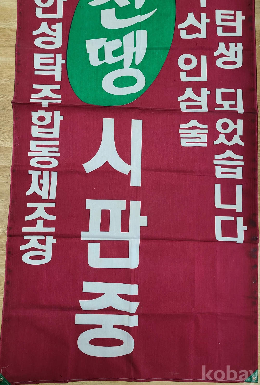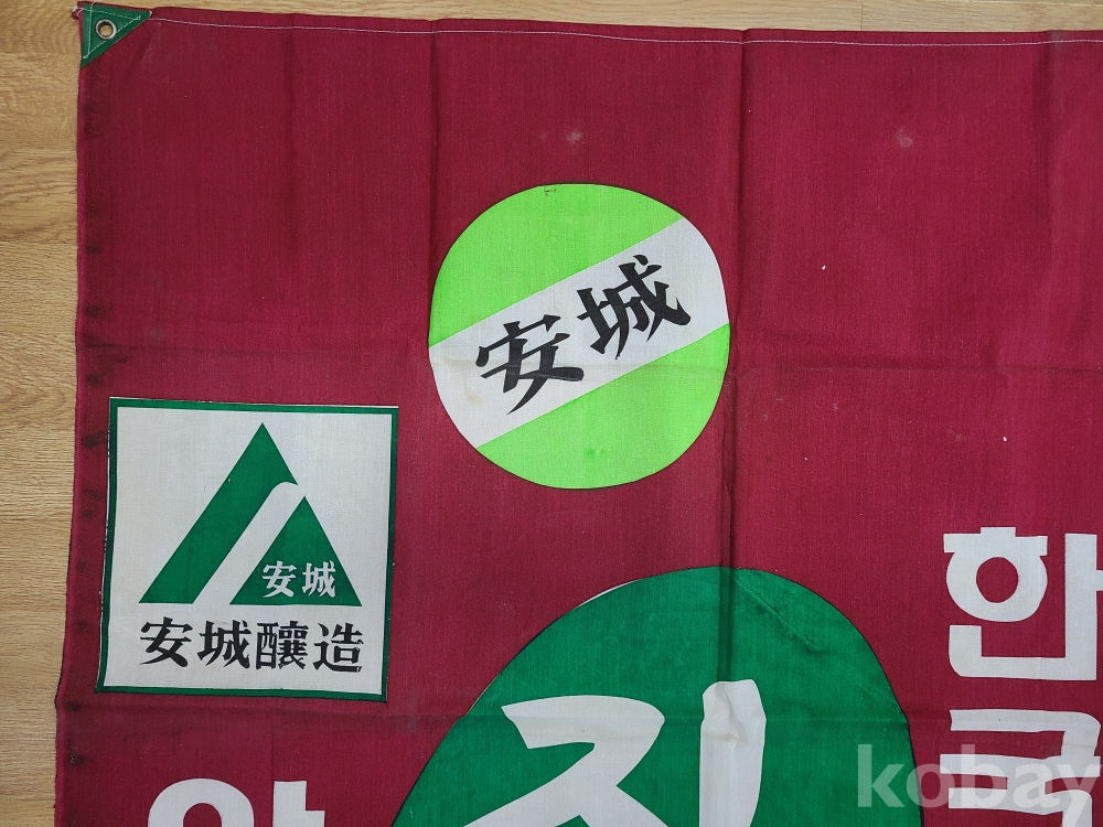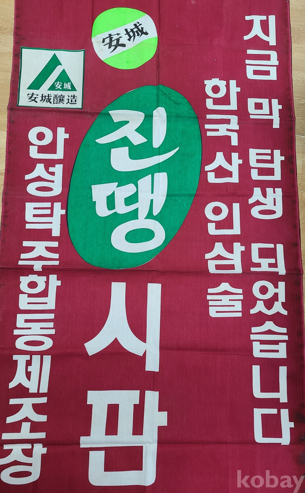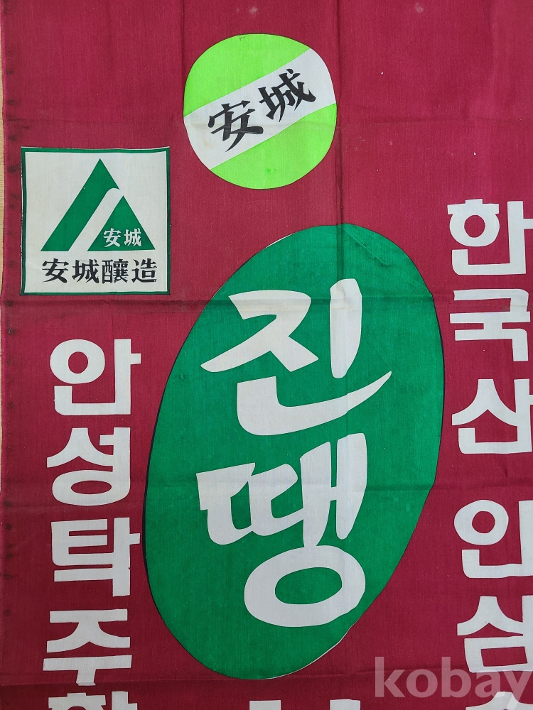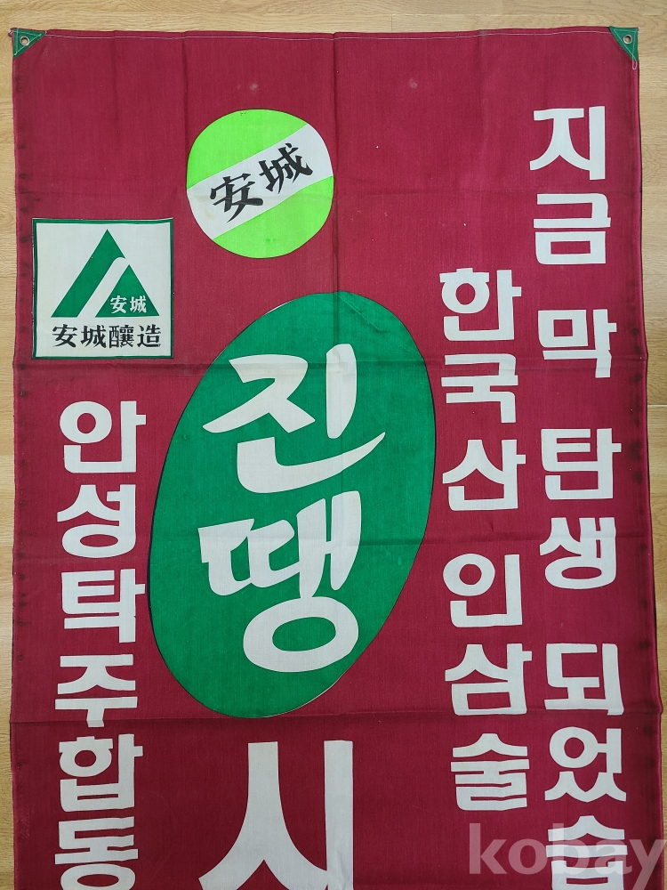 安城釀造 대형 프랑카드 ‘안성탁주합동제조장’ ‘진땡 시판중’ ‘지금 막 탄생되었습니다’ ‘한국산 인삼술’ 문구가 들어있다