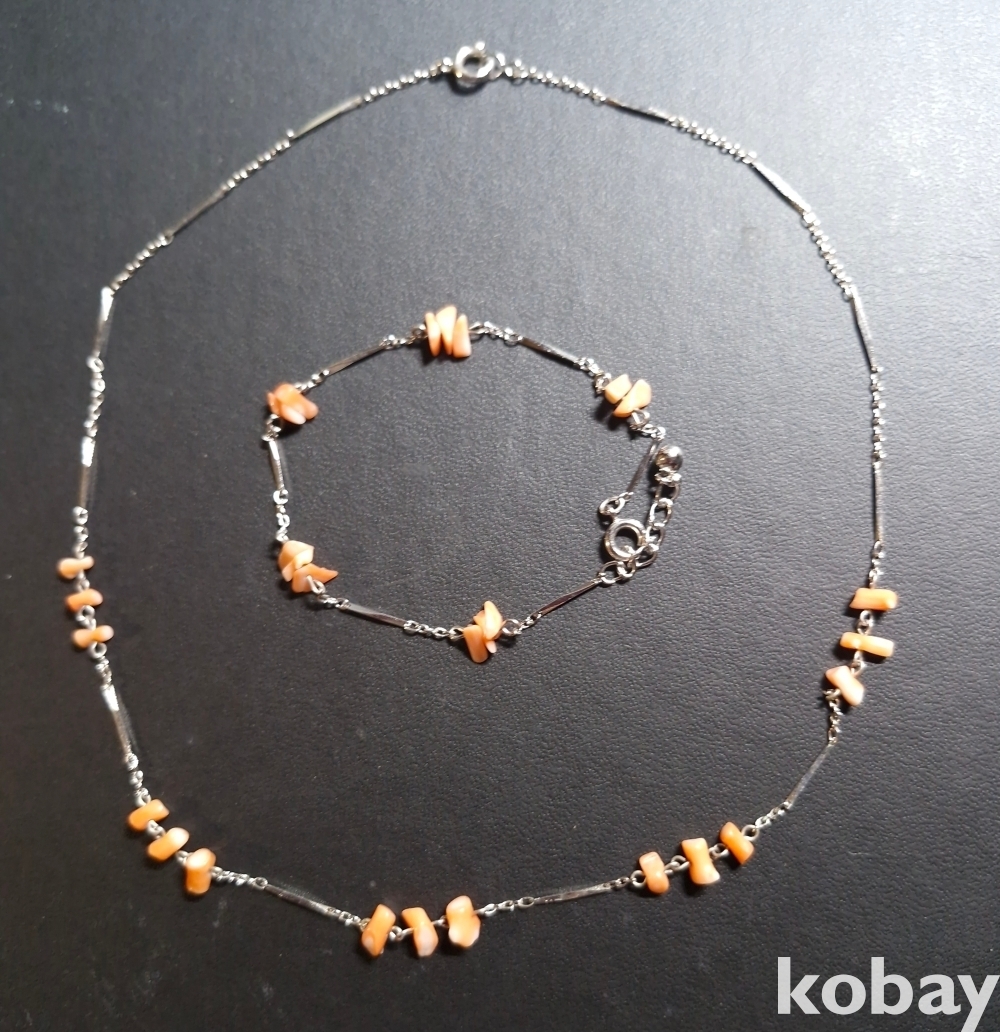 천연산호칩과 서지컬 줄로 만든 목걸이 팔찌입니다.