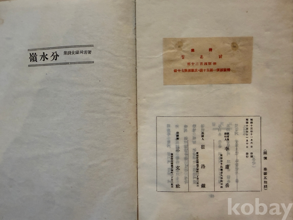 설 명 | 1938년 일본 동경에서 420부 한정판으로 발행하였다. 책 끝에 후기로서 저자의 「꼬릿말」이 있고, 「검은 구름이 모혀든다」, 「너는 피를 토하는 슬픈 동무였다」, 「그래도 남으로만 달린다」, 「장마 개인날」, 「두만강 너 우리의 강아」, 「우라지오 가까운 항구에서」, 「등불이 보고 싶다」, 「고향아 꽃은 피지 못했다」, 「낡은 집」 등 15편의 시가 수록되어 있다. 특히, 본 자료에는 ‘변두갑(邊斗甲) 兄(형) 애납(愛納) 1938. 11월 용악(庸岳)’이라는 저자의 친필 서명이 있다. 여기서 ‘변두갑(邊斗甲)’은 평론가로 보인다. (『문학평론』 1947년 4월호에 그의 평론이 수록됨) | |||||