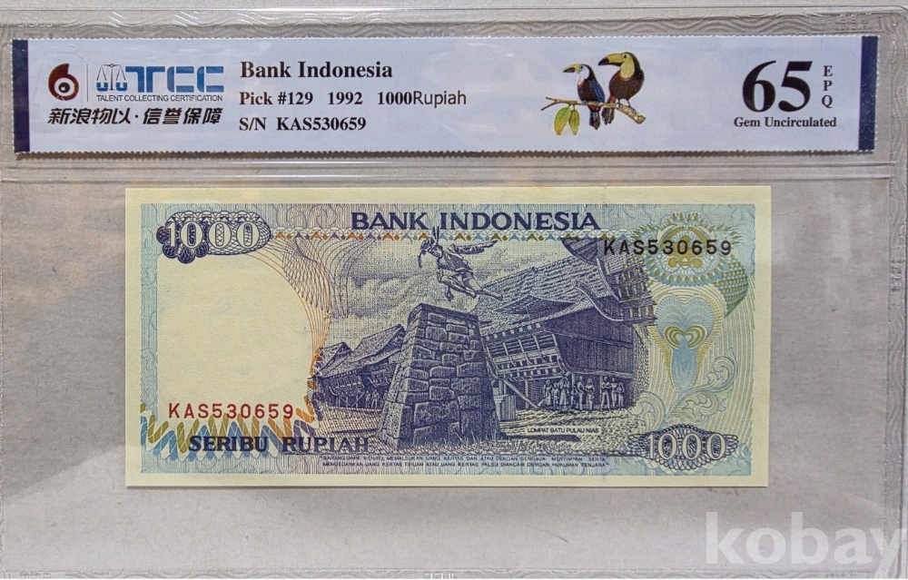 -1992년 인도네시아 1000루피아 지폐 TCC65 등급 입니다.