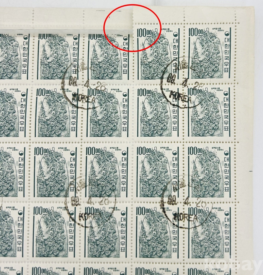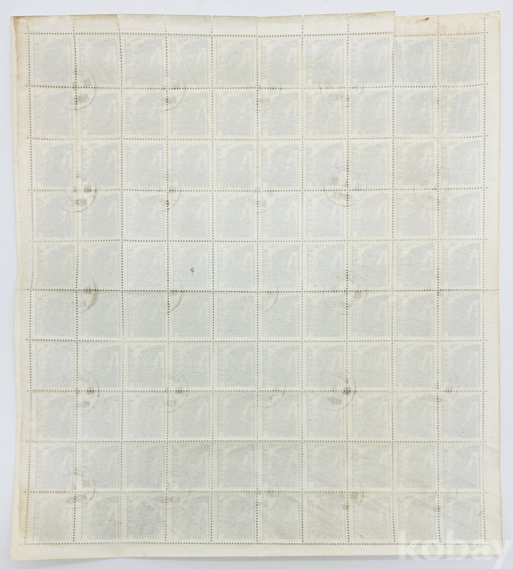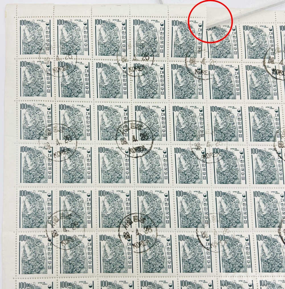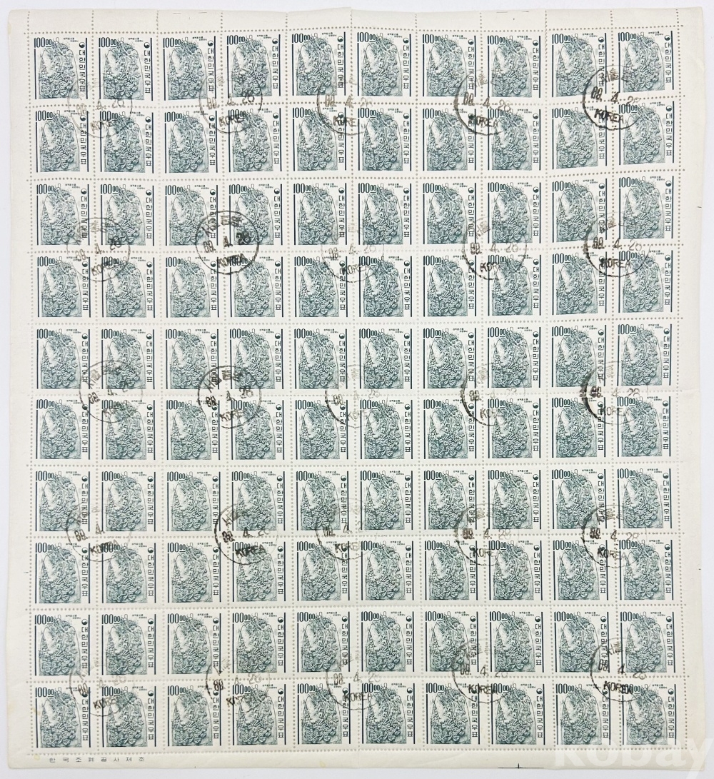 상품 설명 | 1964년 발행한 '선덕왕 신종비천무늬' 100원 보통 우표 전지 이다. 사용제(주문소인), 1989.4.28. | ||