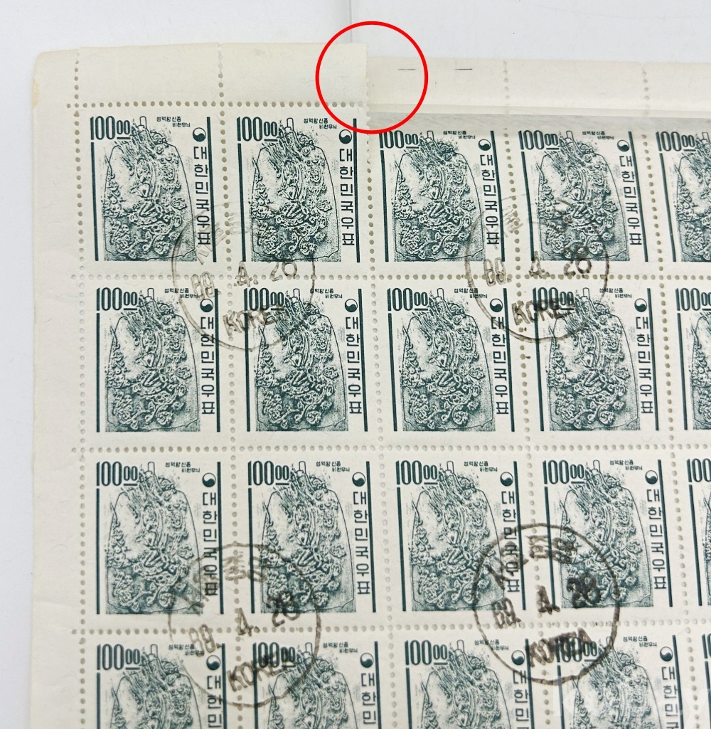 상품명 | 선덕왕 신종비천무늬 보통 우표 전지 100매 | ||