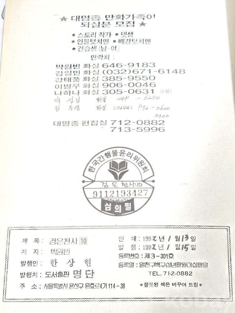 80-90만화방 ==청소년 만화 / 박원빈 글.그림 = 검은천사== 10권 완질