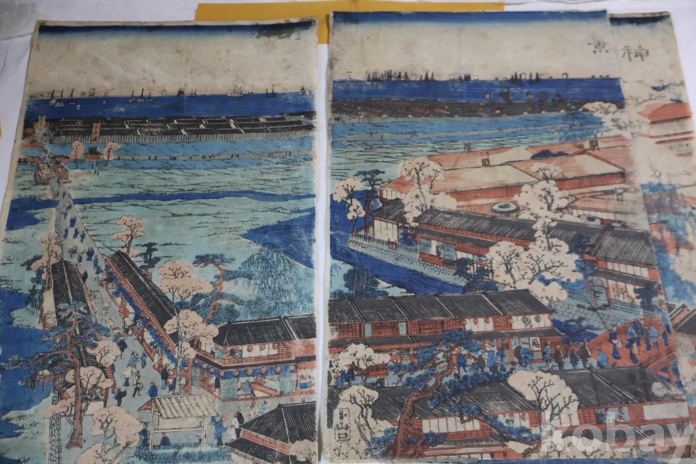 우키요에 목판화 원본 임니다 19세기 원본 이며 화가의 낙기가 없는 멋진 디자인 정교한 그림 고테미를 가진 명화 임니다 요코하마의 원경 임니다